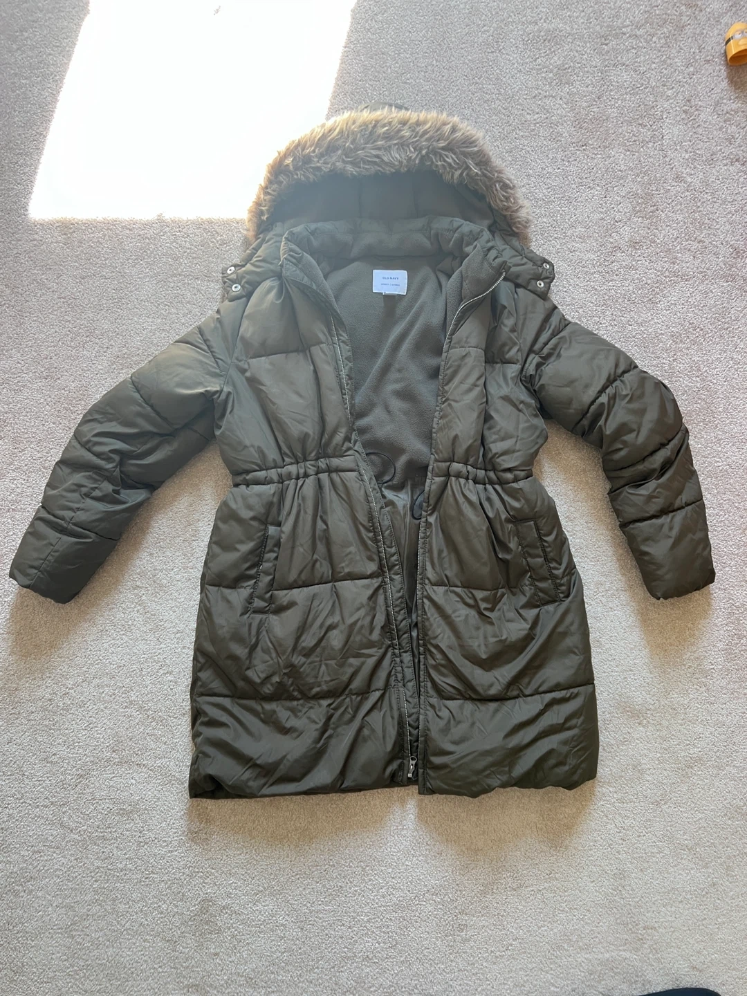 Cozy Old Navy maternity puffer coat in a lovely olive green! It's a size small. Perfect for staying warm during those chilly months. Only wore for one season.