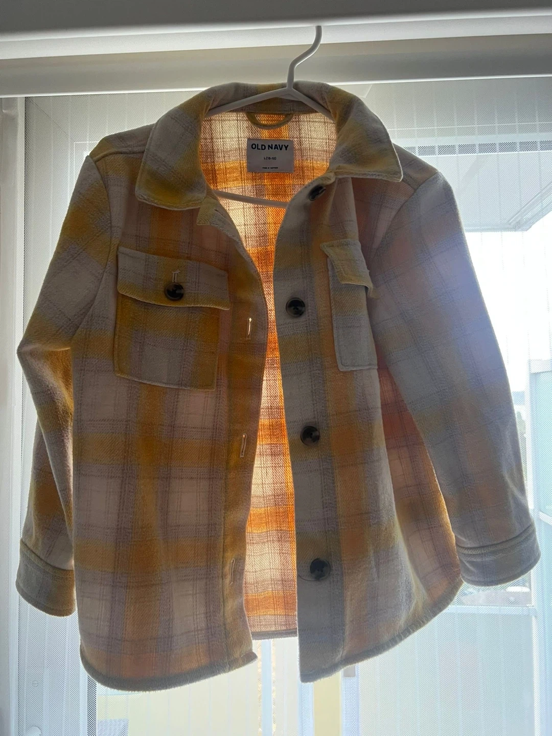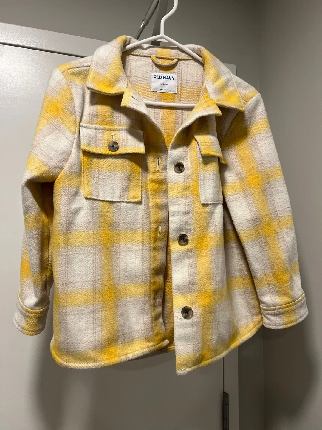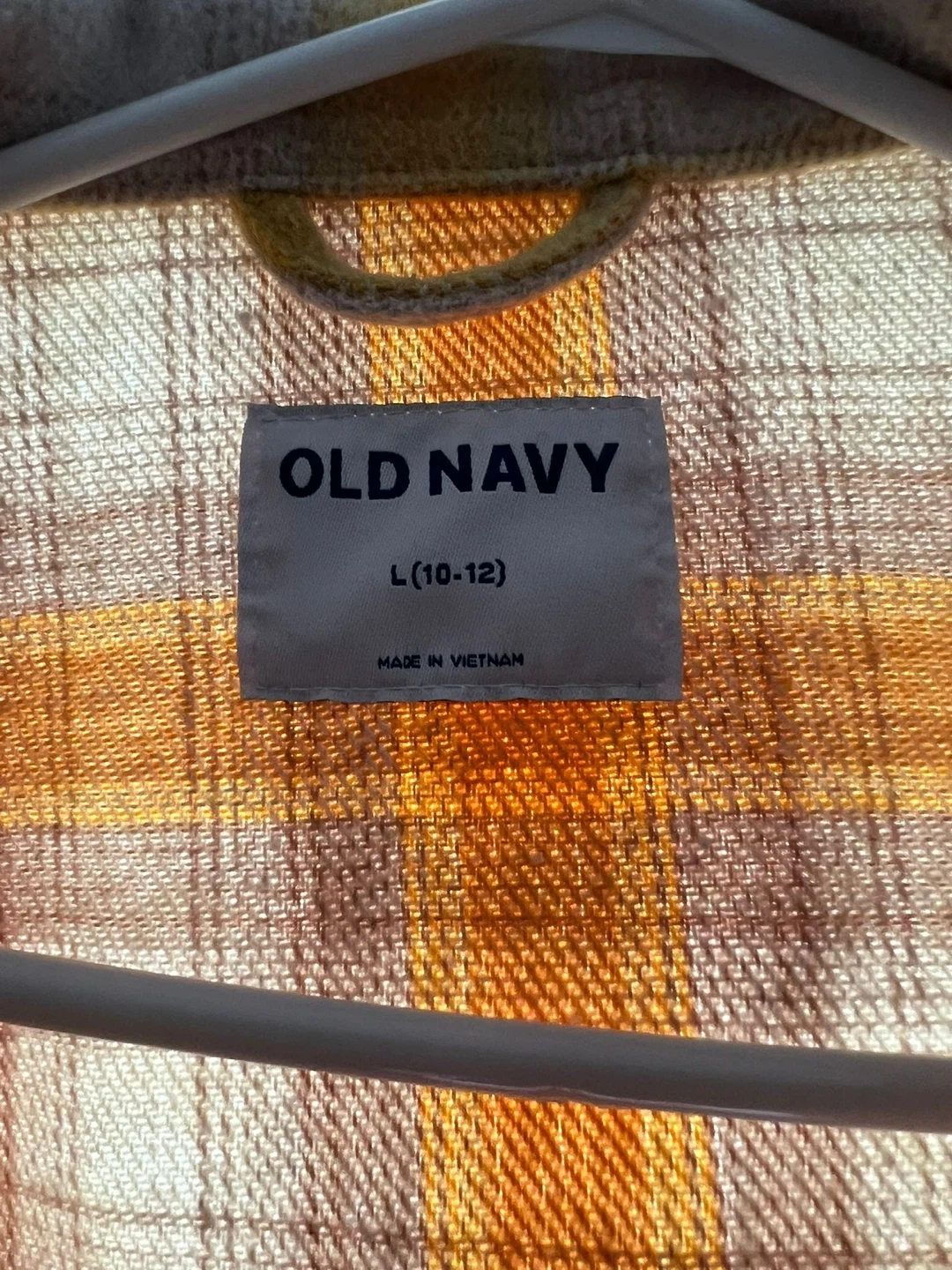 Cozy up in this adorable Old Navy flannel shacket! It features a classic plaid pattern in shades of yellow and white. Perfect for layering on cooler days, this shacket is a size L (10-12) and is in great condition! It's a stylish and comfortable addition to any wardrobe, must pick up in New westminster close to royal columbia hospital