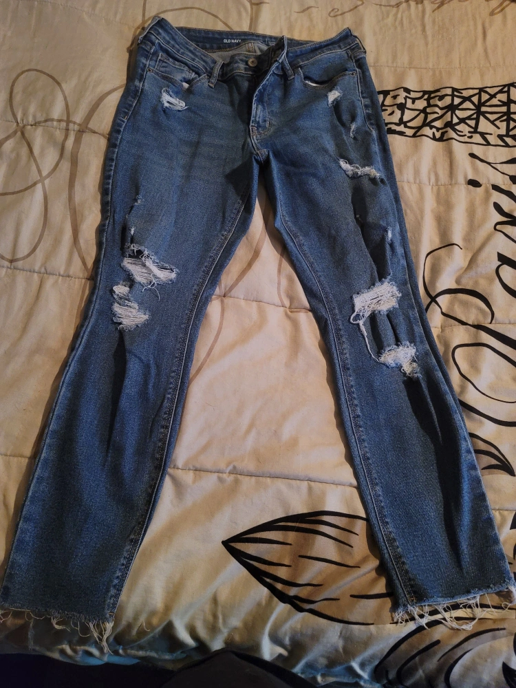 Selling a pair of Old Navy Rockstar Super Skinny jeans in size 10. They are a high-rise style and have a distressed look with rips.