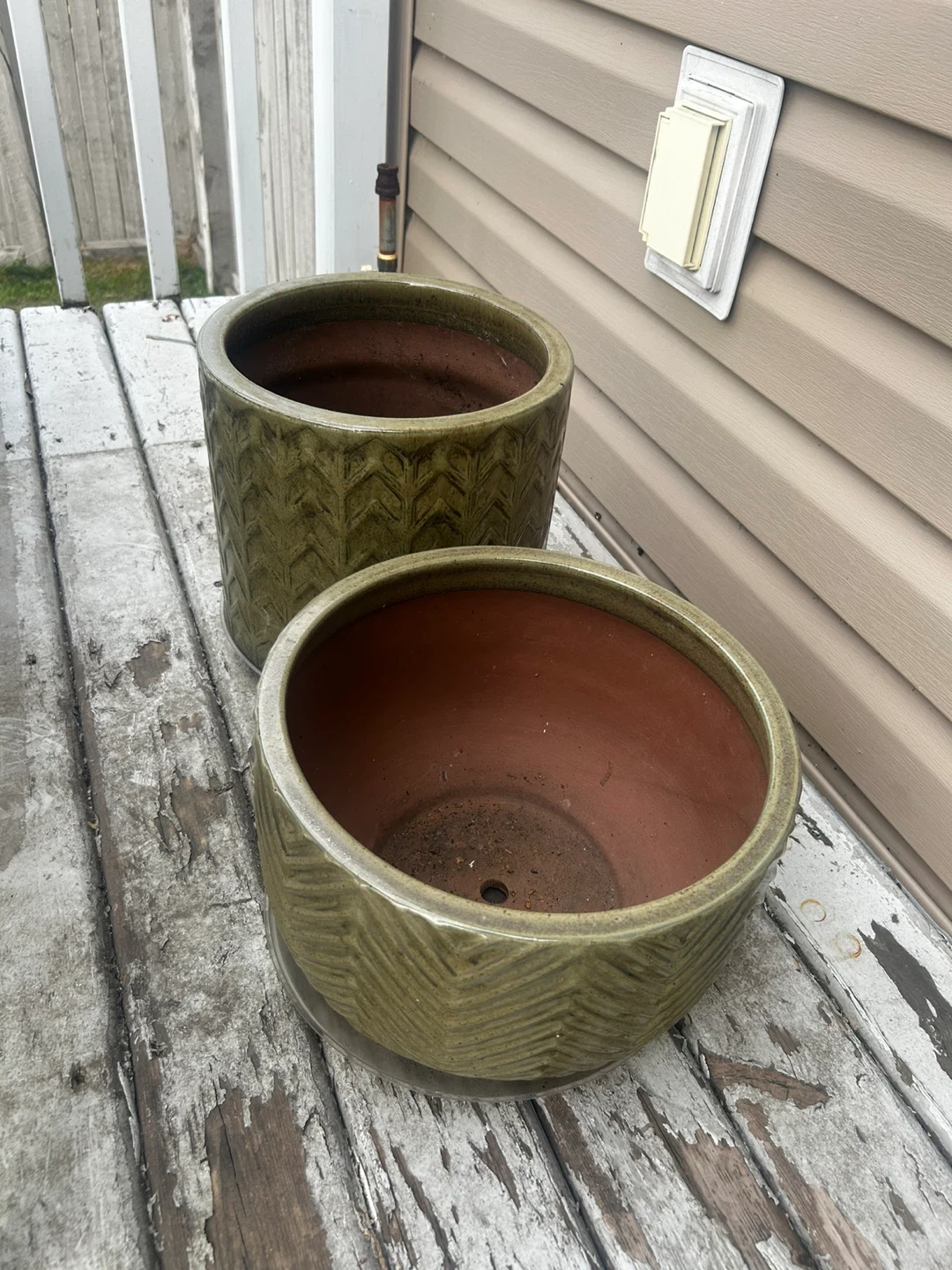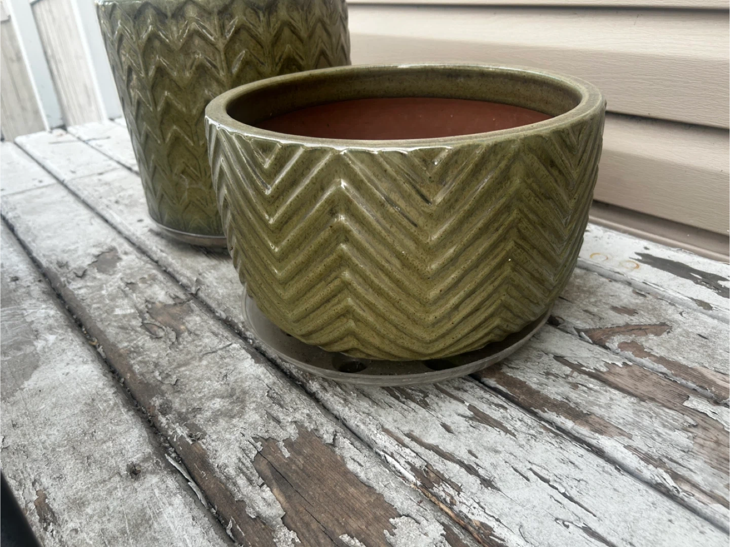 Two lovely ceramic planters in an olive green colour with a textured chevron pattern. They're perfect for adding a touch of style to your indoor or outdoor plants! Both are in great shape and ready for a new home and are very strong and heavy