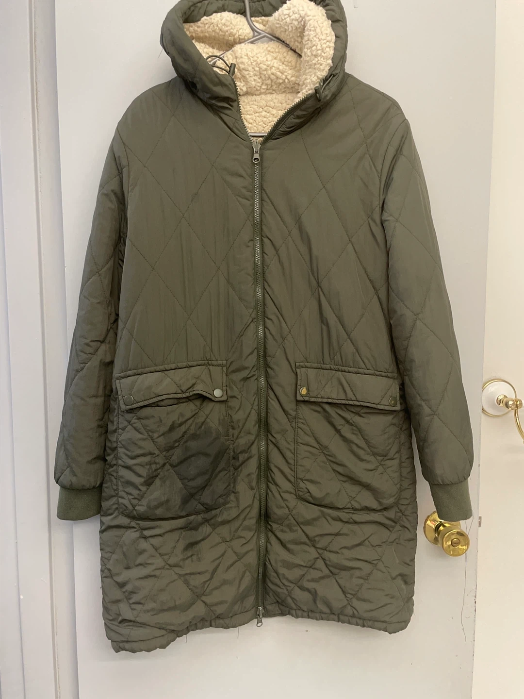 Here's a cozy olive green quilted coat, perfect for chilly days! It features a hood and a warm lining. Great for layering and staying comfortable