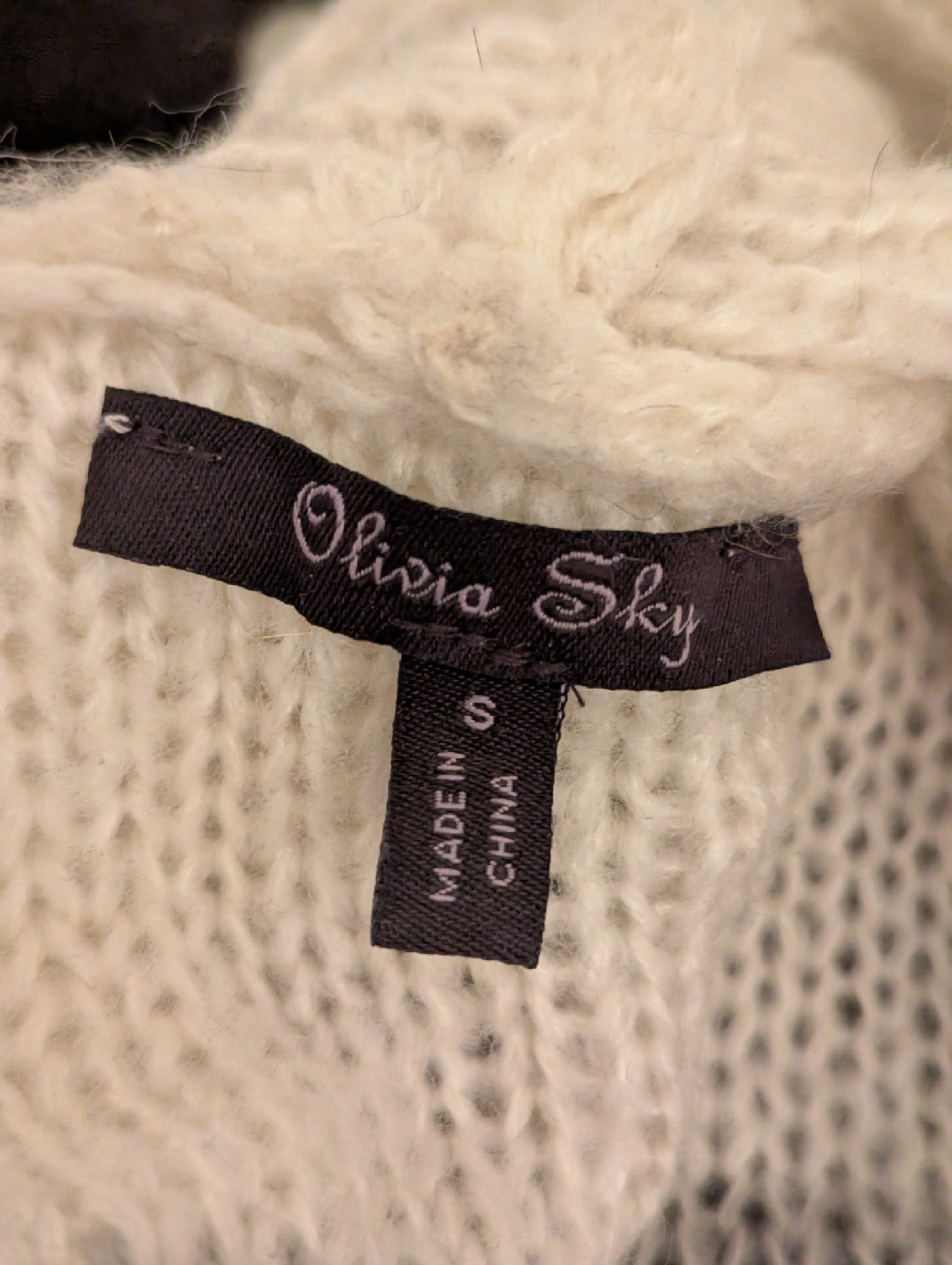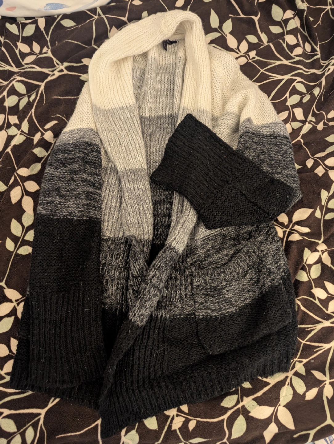Cozy Olivia Sky cardigan for sale! This stylish cardigan features a lovely gradient from black to grey to white. It's made of 100% acrylic and is a size small. Perfect for layering on chilly days! Open to bundle deals. Pickup only.