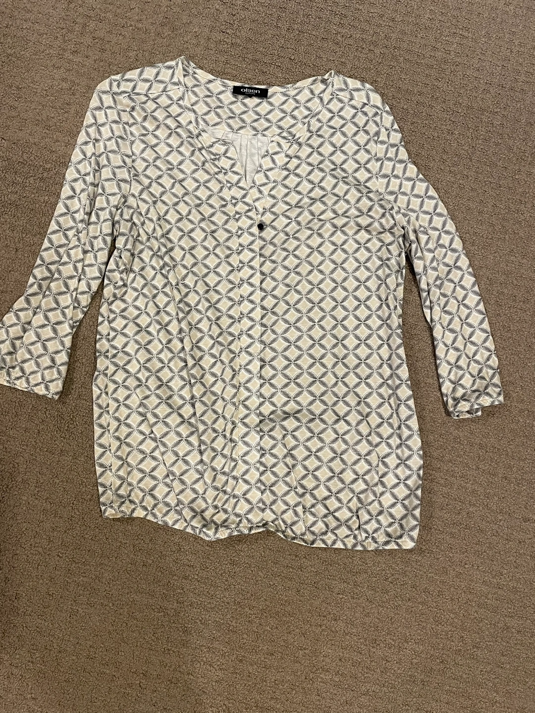 White and black geometric pattern blouse with three-quarter sleeves and a button front.