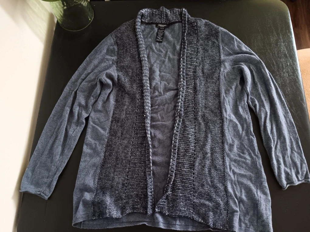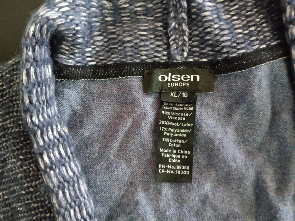 A cozy Olsen Europe cardigan in size XL/16. It's made of: - 44% Viscose - 28% Wool - 17% Polyamide - 11% Cotton