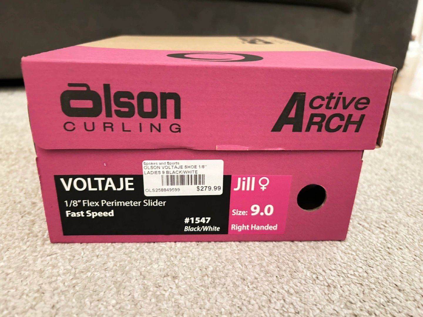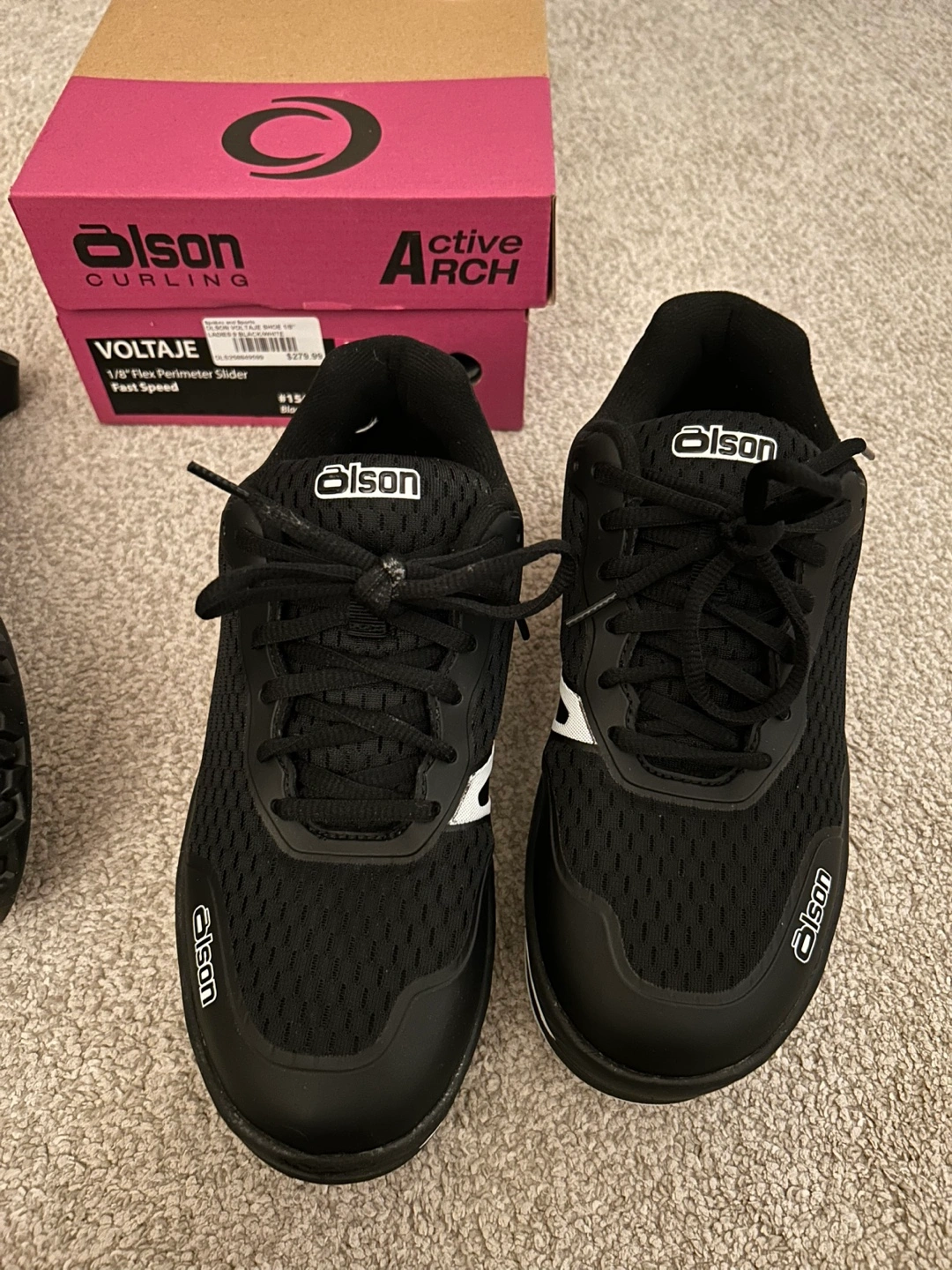 Women’s Size 9** Olson Curling Shoes (right handed) Model: Jill - Voltaje 1/8” Flex Perimeter Slider Colour: Black/white Bought last November 2024 Worn 4 times Comes with two Olson grippers. **Note about size: I am normally 8.5 - these are really cozy and warm, thus have a thicker lining and feel amazing. Thus, went up to size 9. Reason for selling: Heard great things about Olson shoes, wanted to try them. However, they just did not work with my feet and so I went back to another brand I have always worn previously.