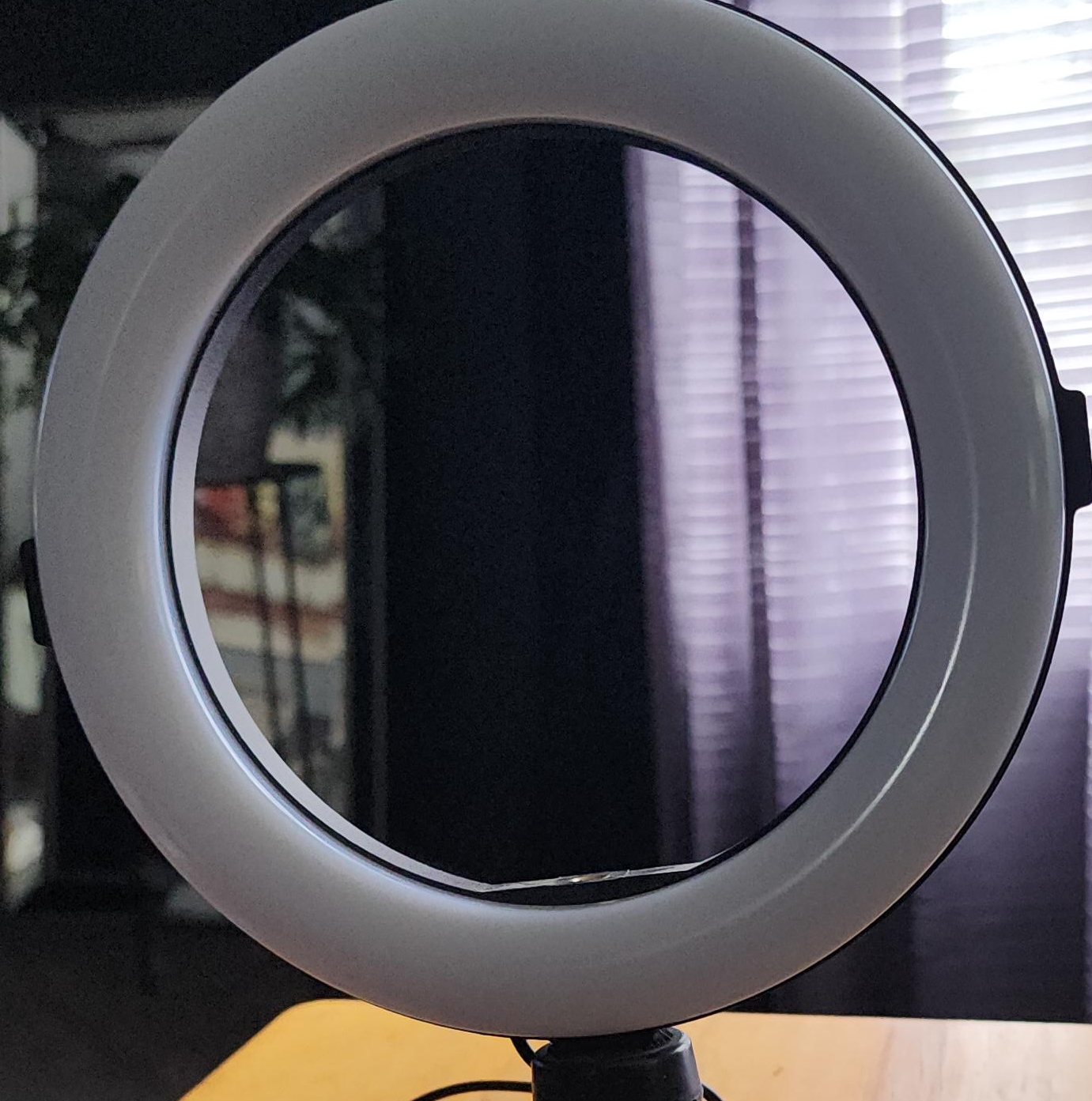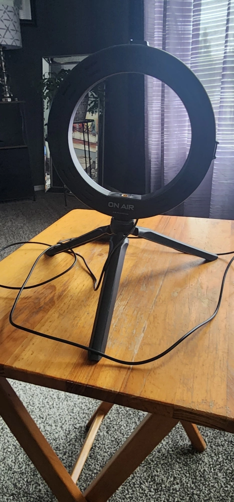 Selling an ON AIR ring light with a tripod. It's in great condition and ready to use for your videos or photos! The light is a ring shape and comes with its own stand.