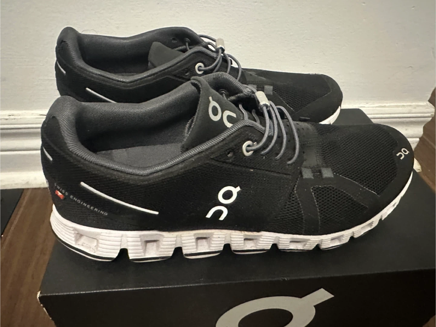 Selling a pair of On Cloud running shoes in black and white. These are a US size 9. They come with extra ON laces and the original box. They were worn on a 5km walk/run for the cure . Retails $220.00
