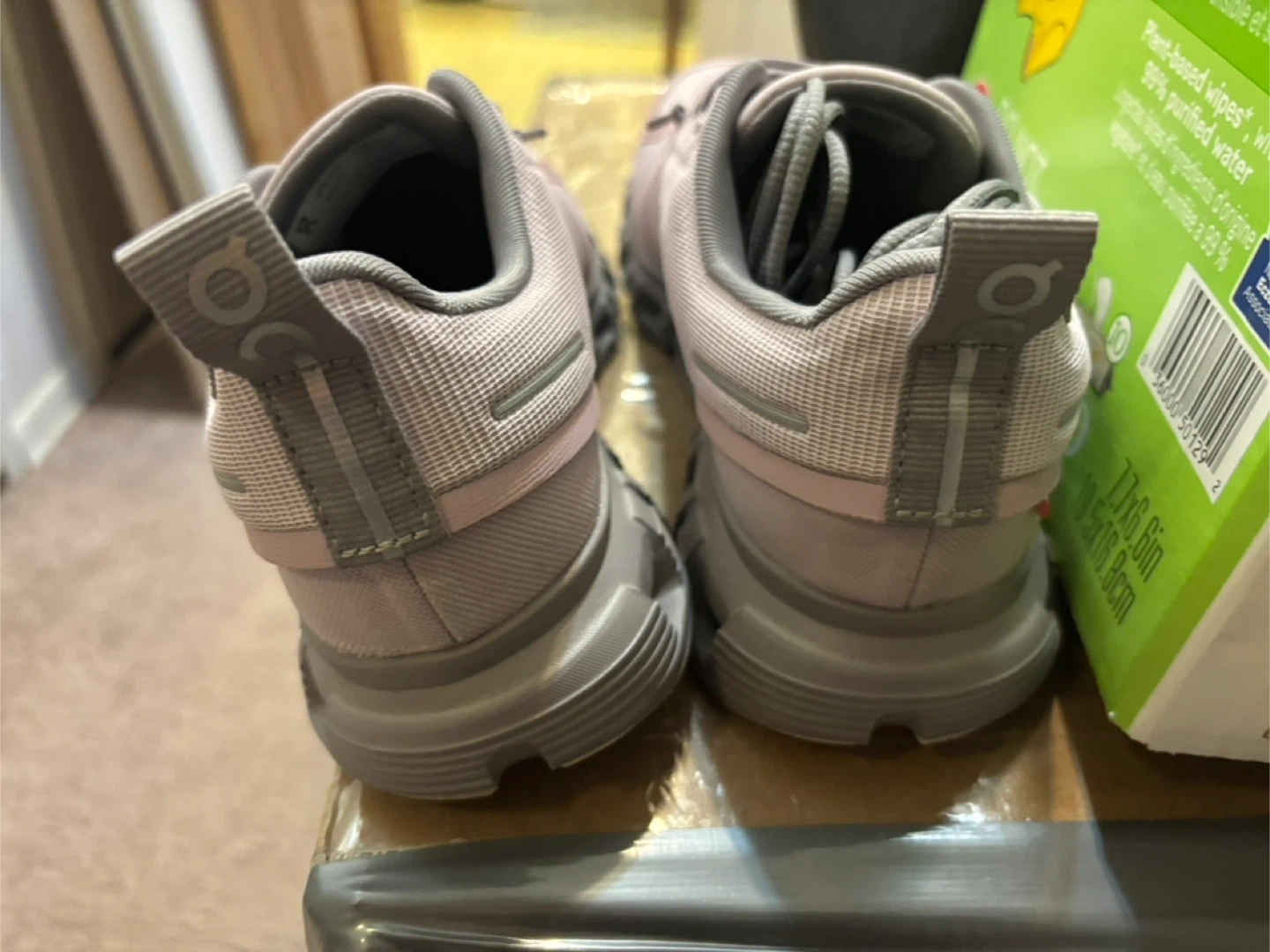 Selling a pair of On Cloud waterproof trail running shoes for women. They are a light purple/grey colour. The soles are in great condition and have CloudTec cushioning and a Speedboard for added comfort and performance. Great for hiking or running! Size USW6
