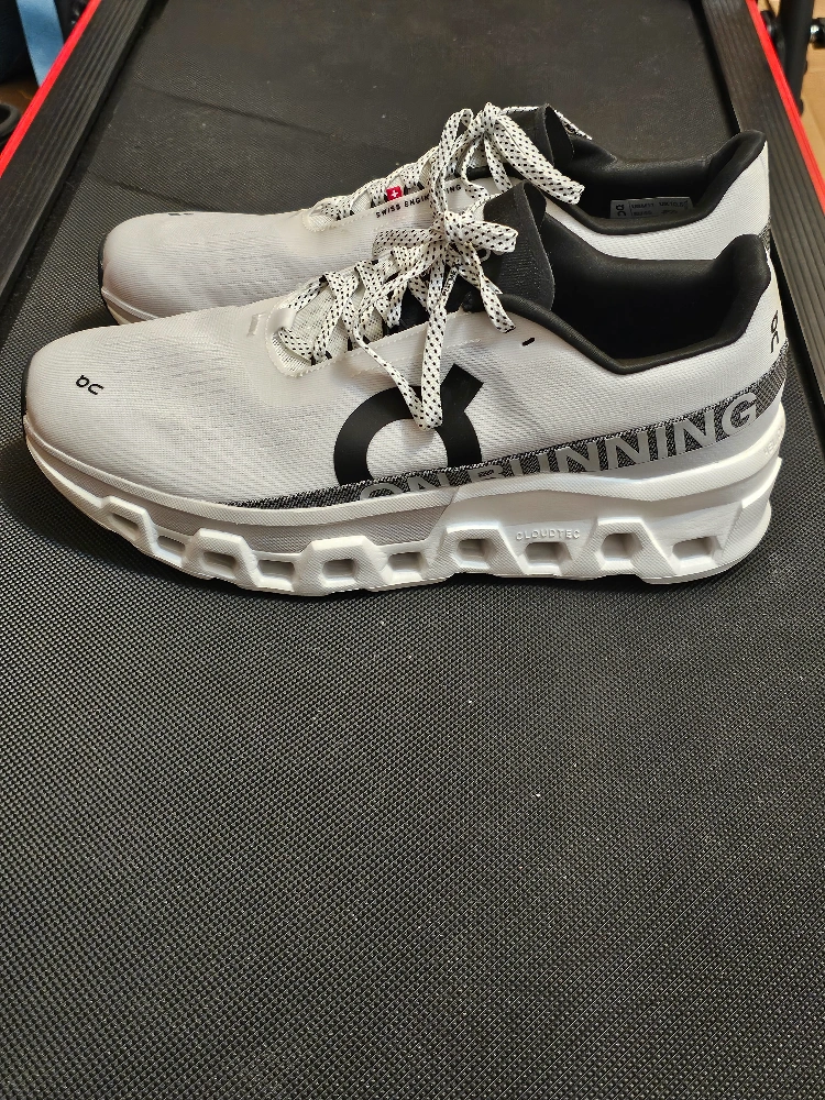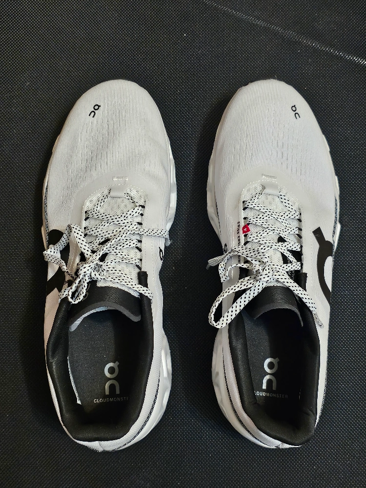 Selling a pair of On Cloudmonster 2 running shoes in white and black. These shoes are designed for maximum cushioning and energy return, making them great for everyday runs and longer distances. They feature On's signature CloudTec sole for a comfortable and responsive ride. Check them out!