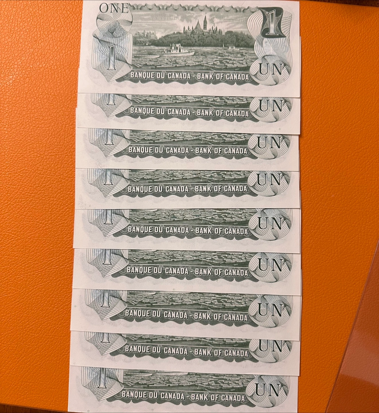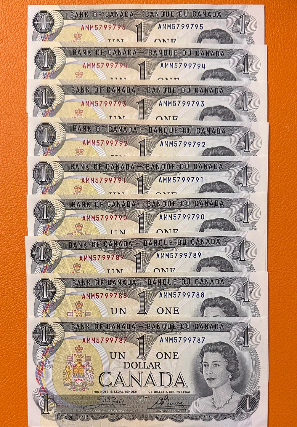 Selling 9 vintage rare consecutive serial nos. Canadian one-dollar bills 1973 UNC. These bills feature a classic design and are in good condition for their age. A great addition to any collection! Please take a look at other listings and put together a bundle for great savings 🥰 Pick up is Eglinton Ave/ McCowan rd area.