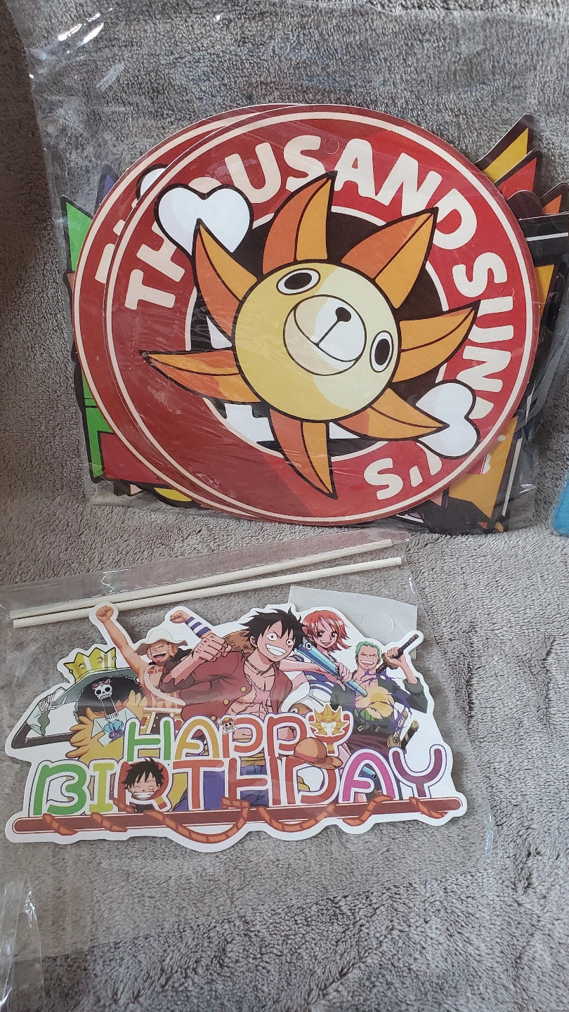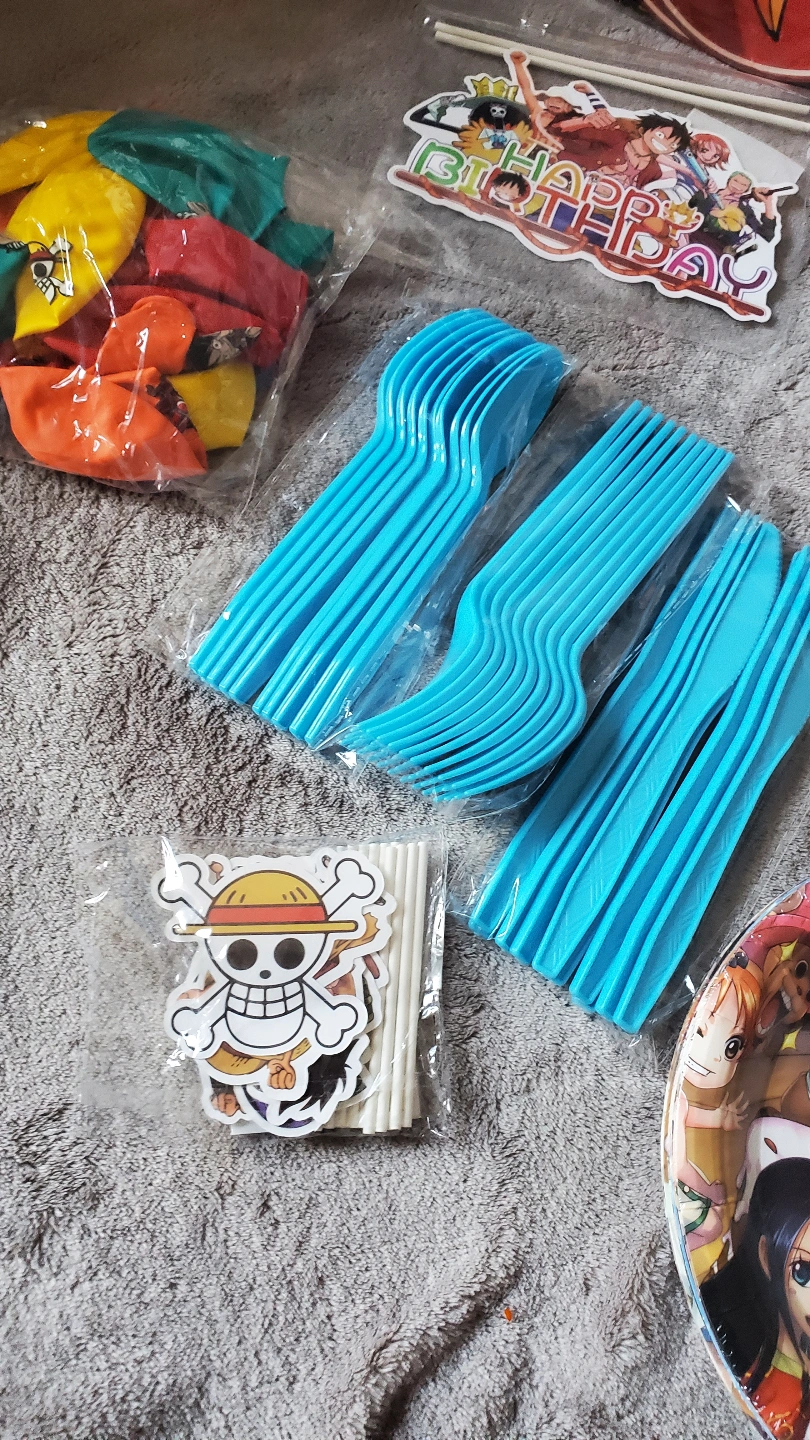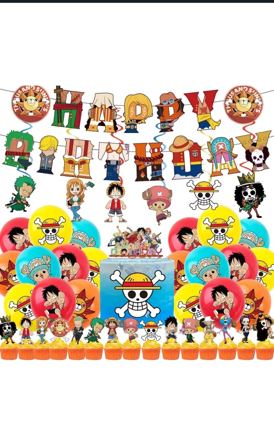 Complete One Piece themed party pack. Includes 10 dinner plates, 10 dessert plates, 10 cups, napkins, 30 cutlery, 12 balloons, 1 cake topper, 12 cupcakes topper, 1 banner, 6 swirl decorations and 1 table cover. Perfect for a One Piece fan's birthday celebration. Pick up Hespeler Cambridge.
