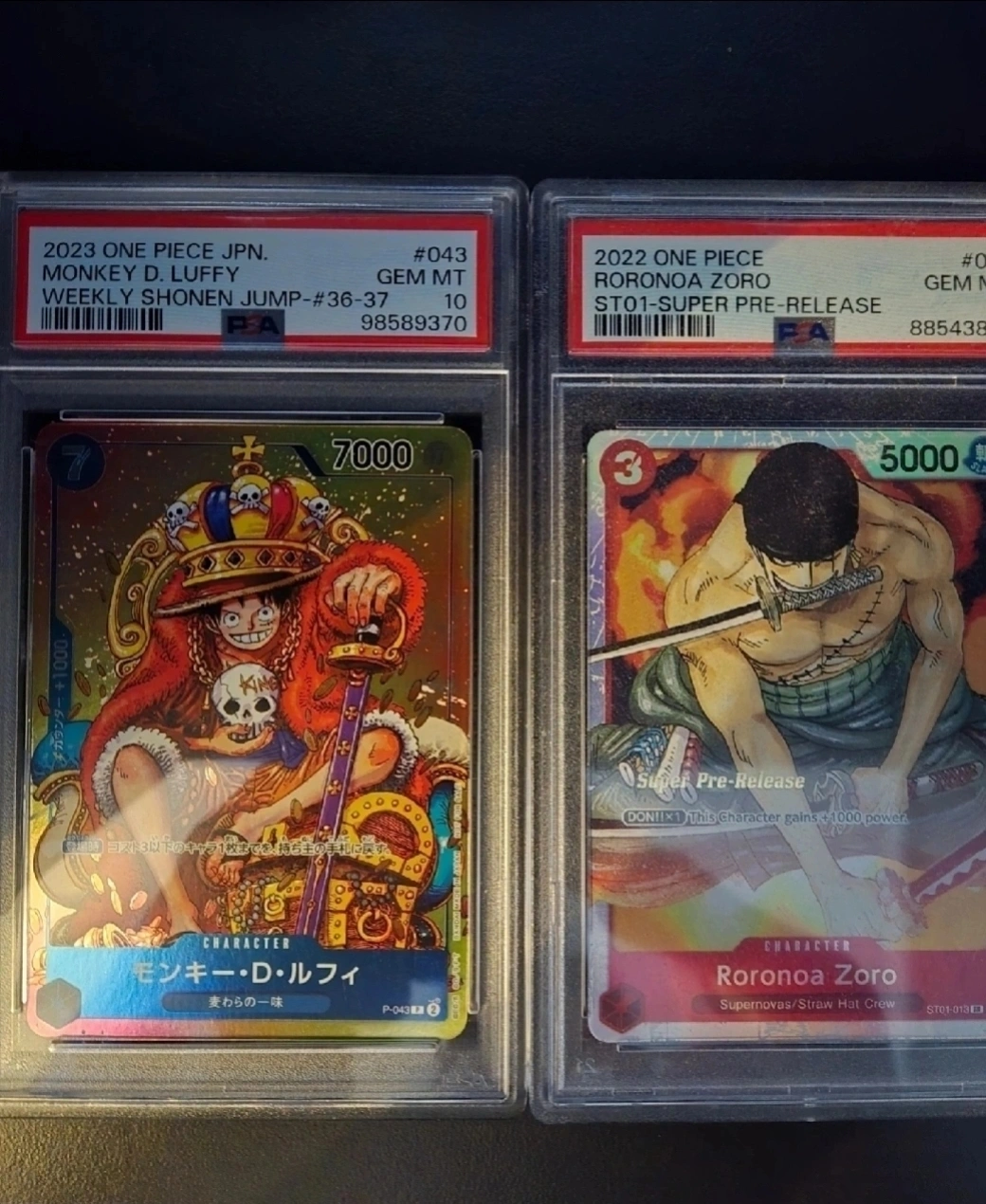130 for 2 psa 10 Selling two One Piece trading cards: - 2023 Monkey D. Luffy, Weekly Shonen Jump-#36-37, #043, GEM MT 10 - 2022 Roronoa Zoro, ST01-Super Pre-Release