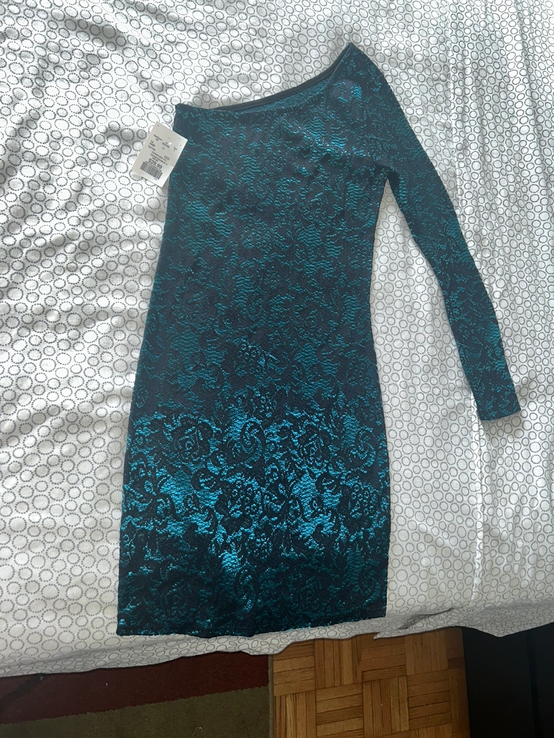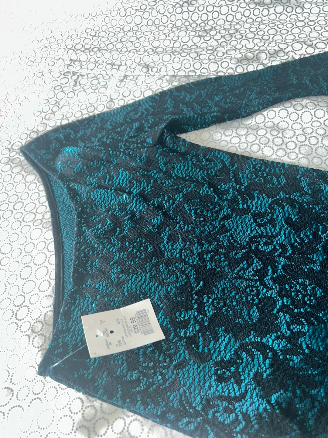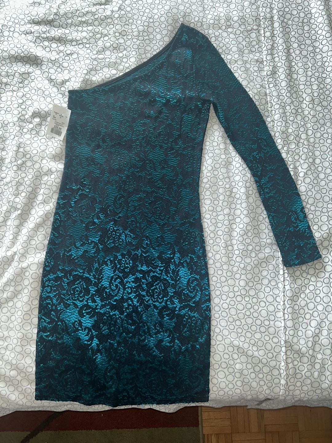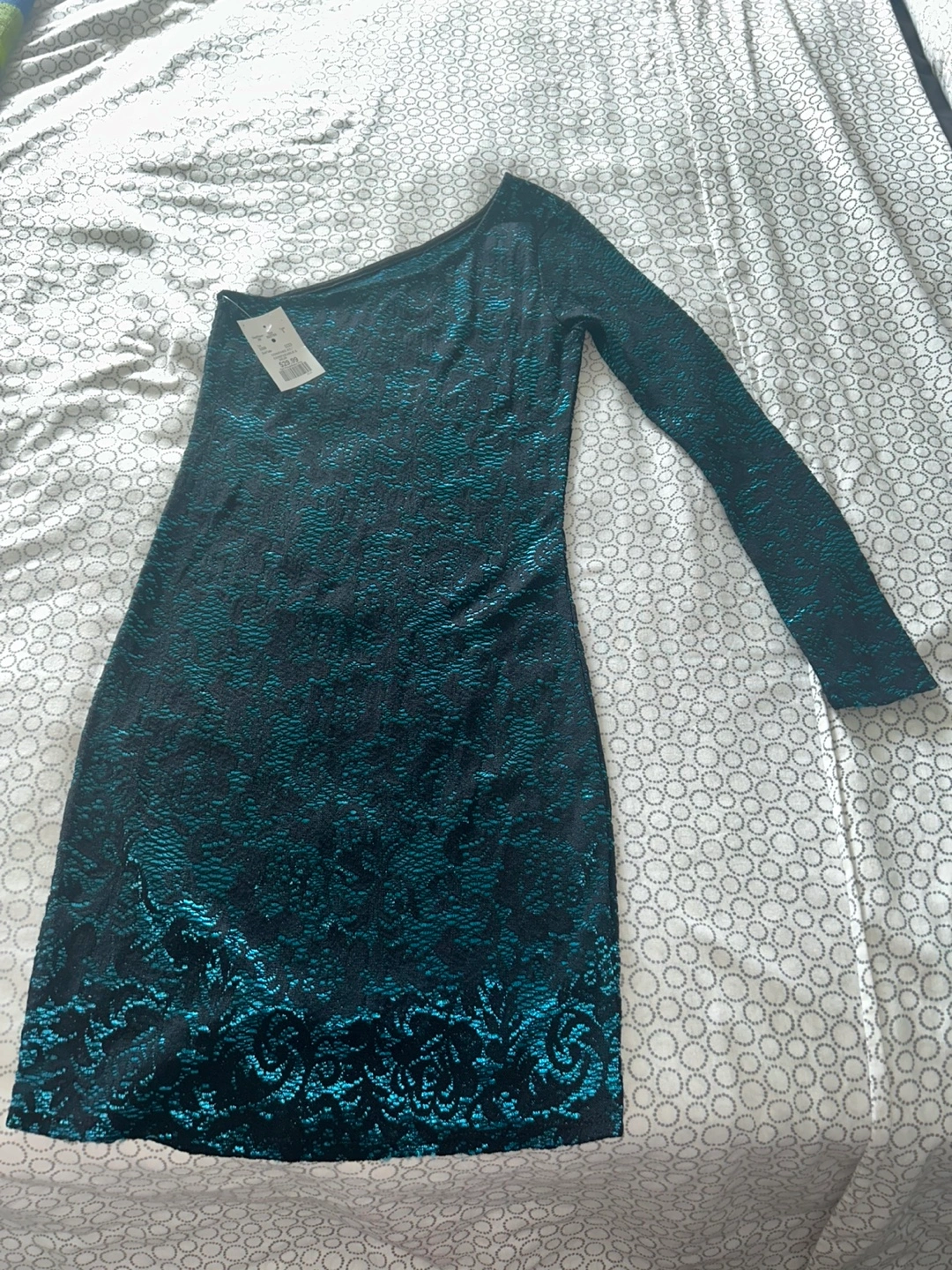One shoulder dress with a lace pattern. Teal and black design. One long sleeve. A great addition to any wardrobe for a night out.