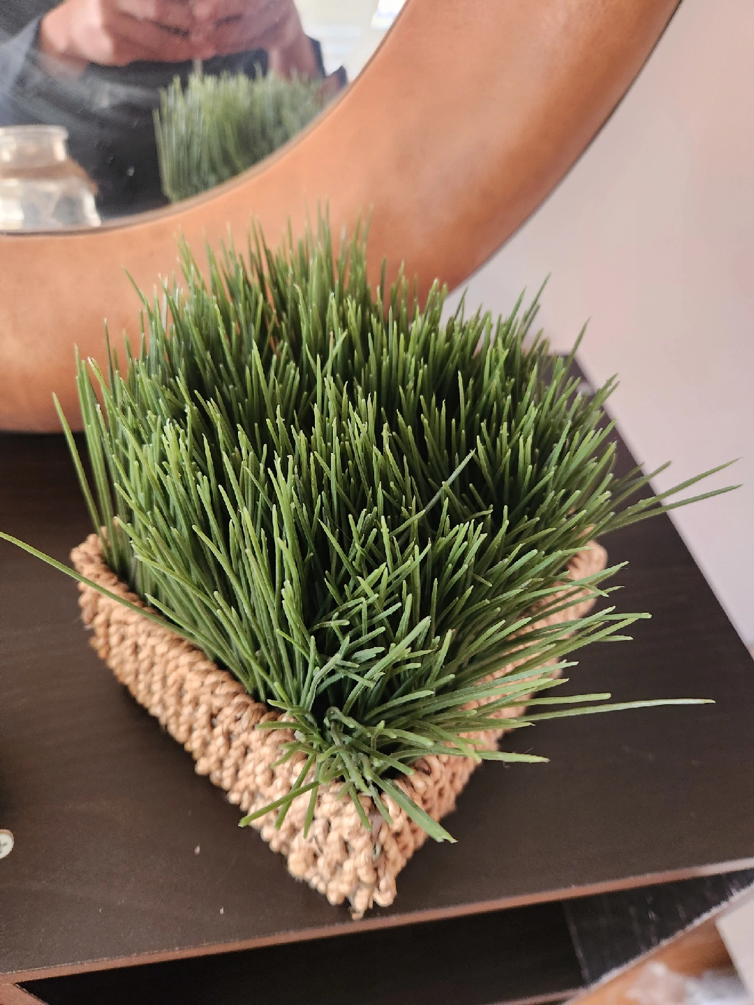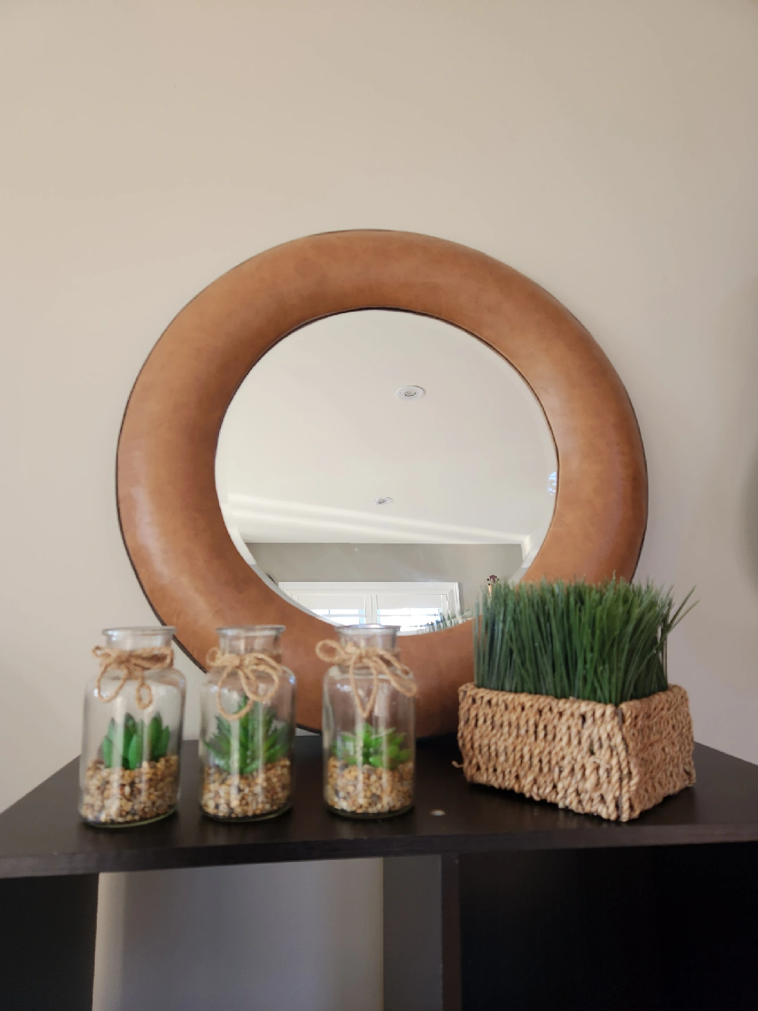 Everything in the photo for only $65!! Solid wood antique style chair Cube shelving unit approximately 3ft high x 2ft wide x 1 ft deep Faux leather framed round mirror, camel/tan colour 23 in diameter Assorted faux plants