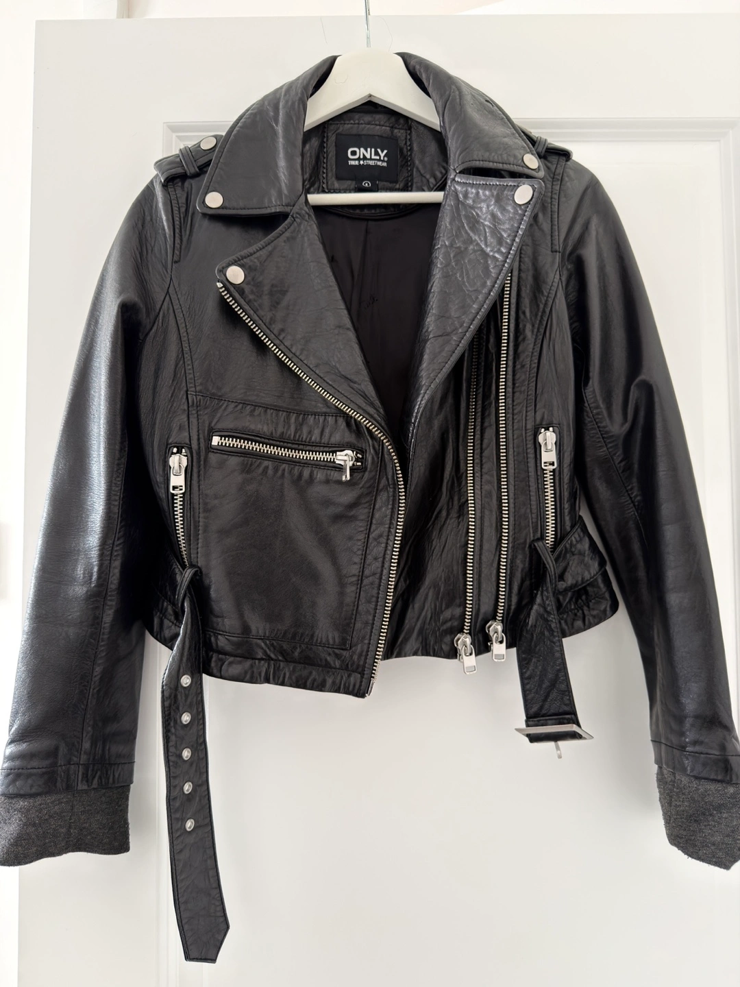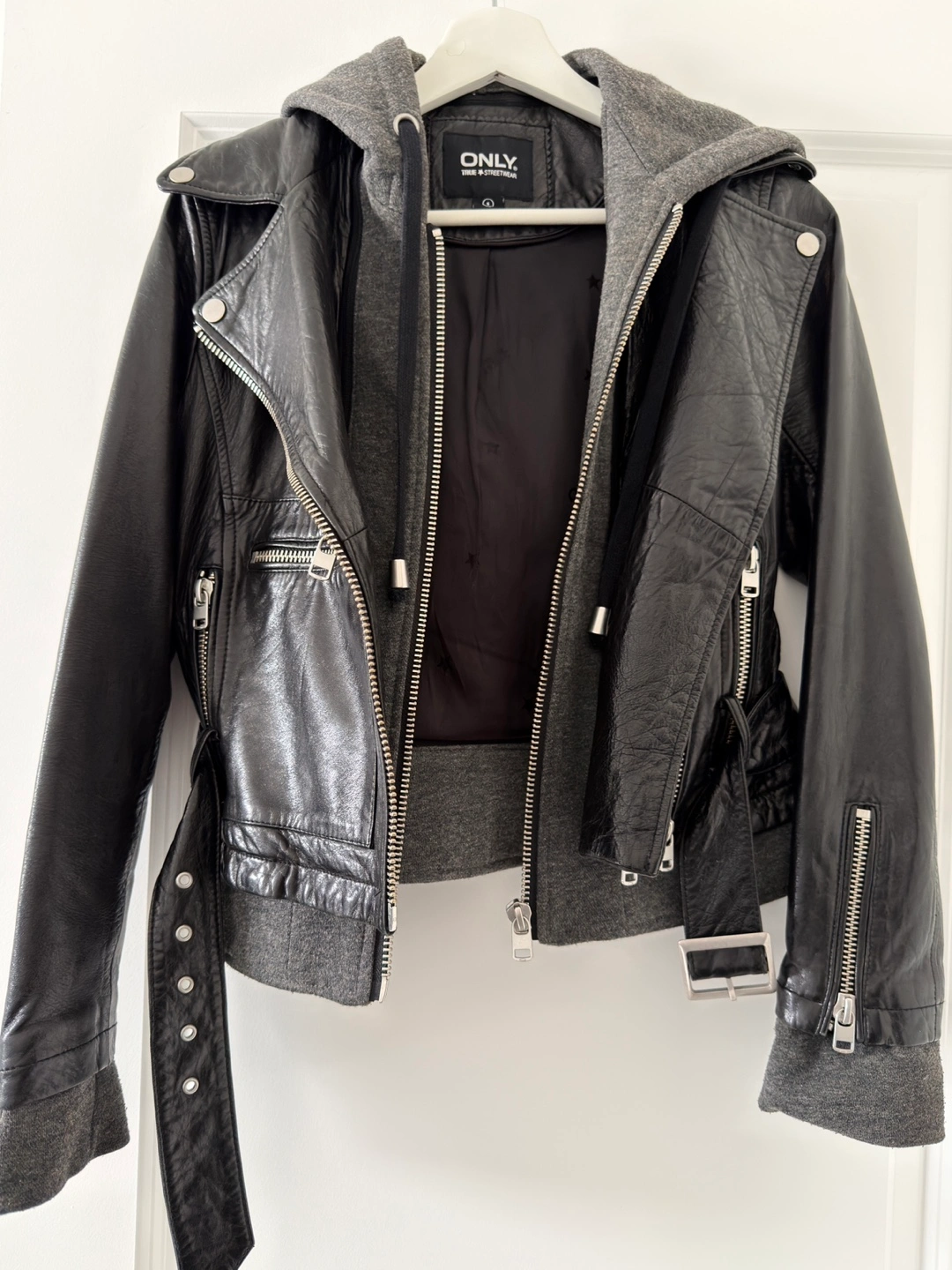 Show allONLY Black genuine Leather Jacket (Size S) detachable hood