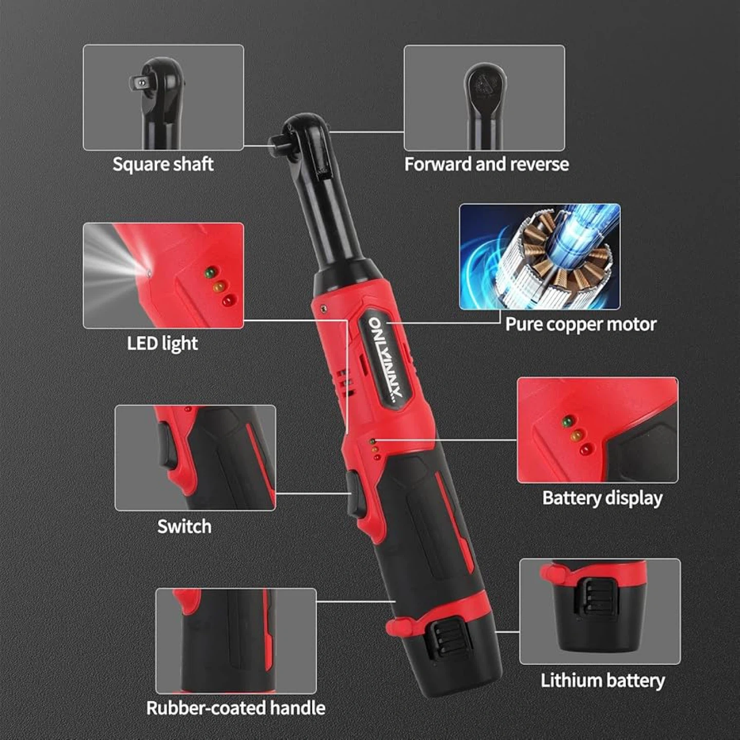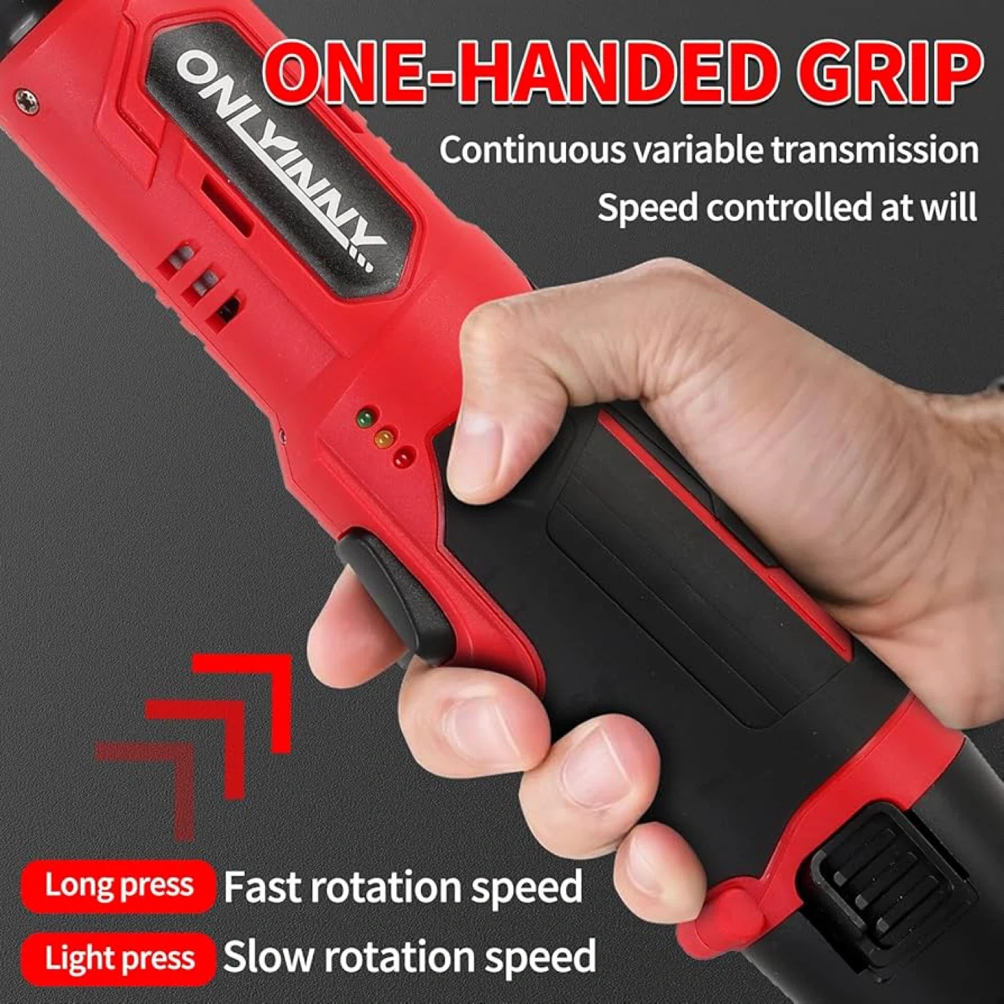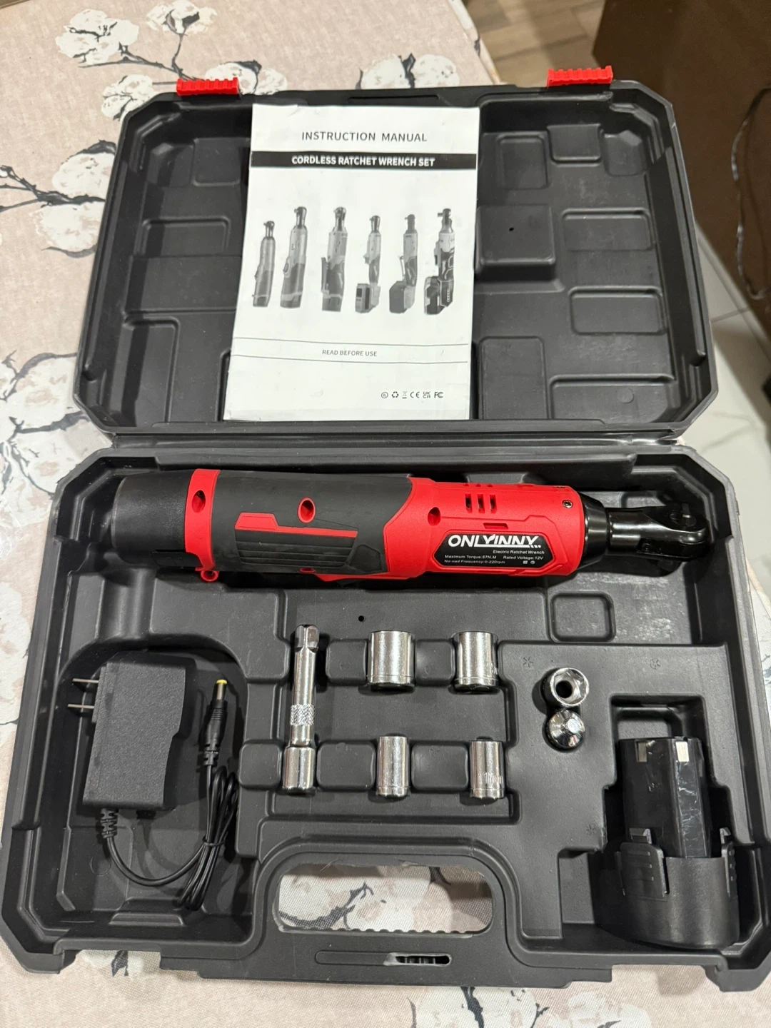 Selling a brand new ONLYINN cordless ratchet wrench set in great condition! It comes with the instruction manual, charger, and various socket sizes. The wrench features one-click forward and reverse, an LED light, and a battery display. The handle is rubber-coated for a comfortable grip