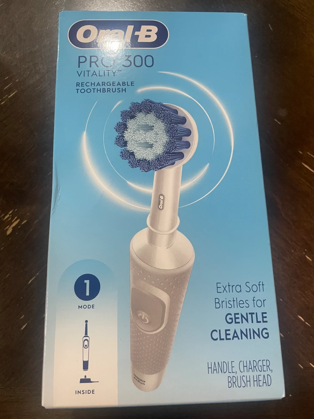 Brand new, unopened. Selling an Oral-B Vitality Pro 300 rechargeable toothbrush. It features extra soft bristles for gentle cleaning. Includes the handle, charger, and brush head. The box is included too!