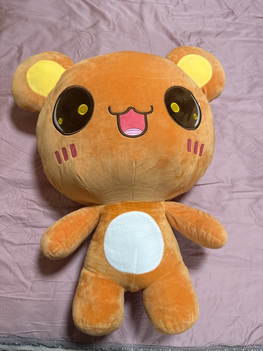 Selling a cute orange bear plush! It's in great condition and ready for a new home. This cuddly bear has a sweet smile and would be perfect for kids or anyone who loves plushies
