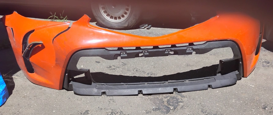 Selling an orange car bumper as shown in the photos. It's in used condition with some visible wear and tear. Please take a close look at the pictures to see the details!