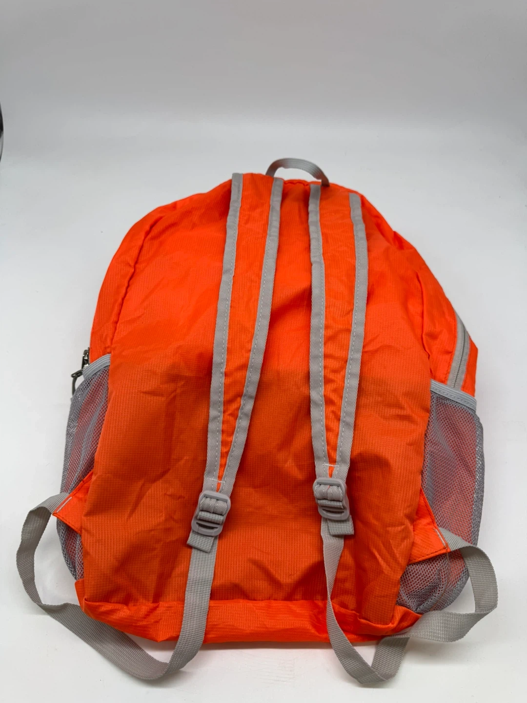 This orange foldable backpack is perfect for travel or everyday use! It's lightweight and portable, making it easy to pack and carry. The backpack features grey accents and mesh side pockets. Great for hiking or day trips