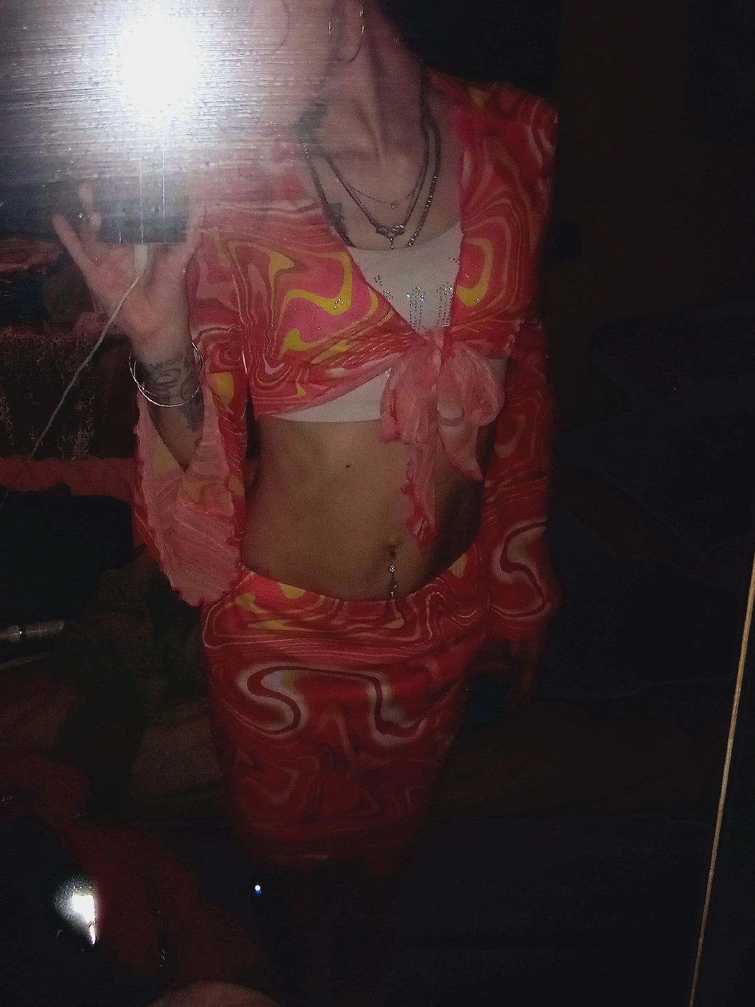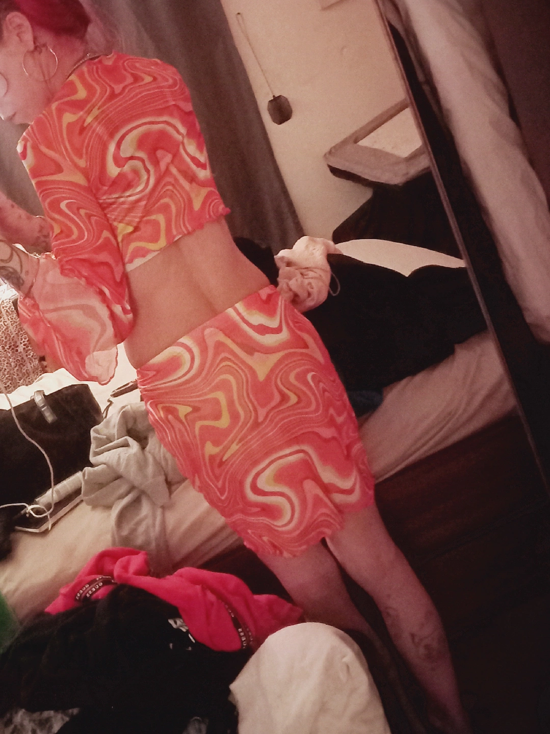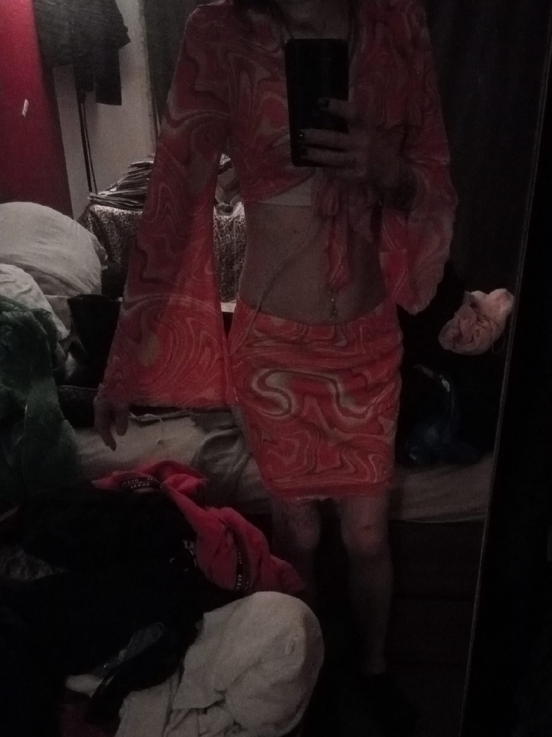 Cute orange patterned two-piece set! This set includes a long-sleeved crop top and a matching mini skirt. Perfect for summer or a night out!