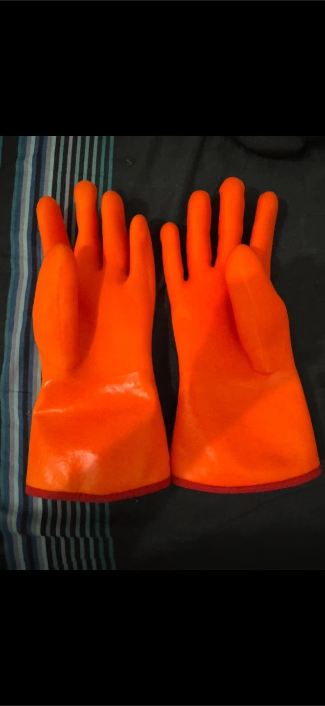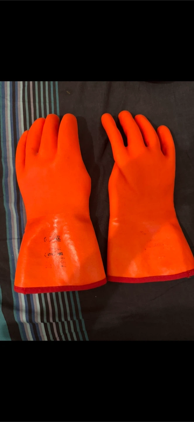 Selling a pair of orange rubber gloves. These are great for cleaning, construction or any other task where you need to protect your hands. They are in good condition.