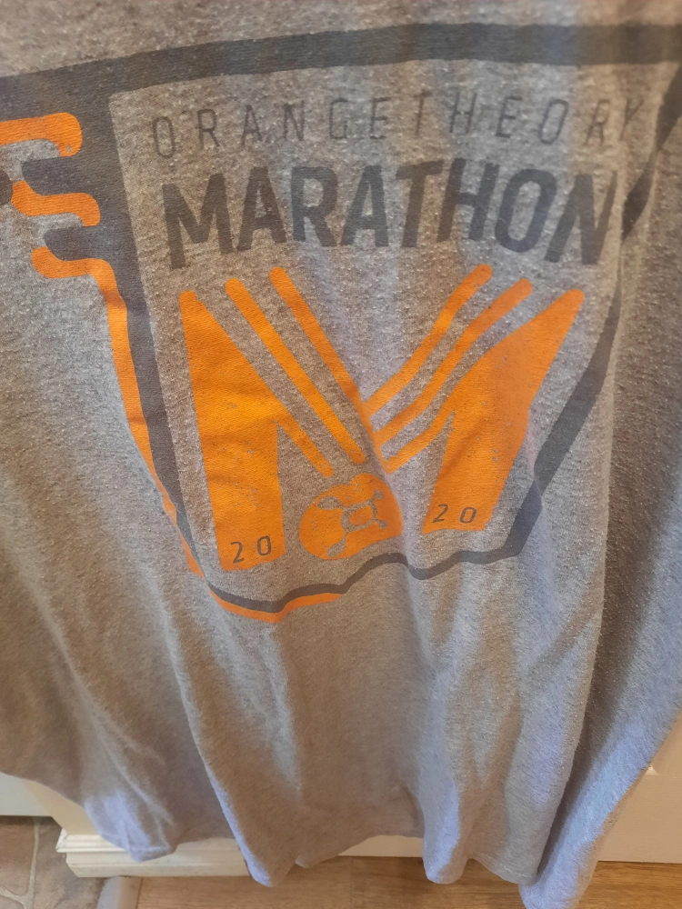 We have here a nice light grey Orange Theory Marathon 2020 t-shirt. size XXL. It is grey with an orange design men's great for everyday wear.