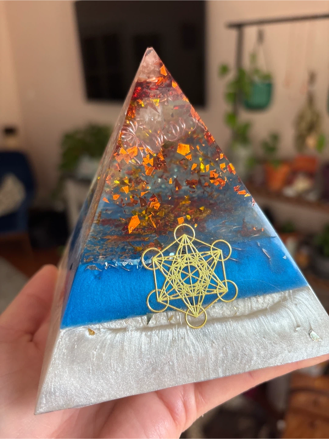 Selling an orgone pyramid featuring Metatron's Cube. It has a beautiful combination of colours and textures, with a white base, a blue layer, and orange flecks near the top. It would make a great addition to any space! contains copper, steel, healing crystals