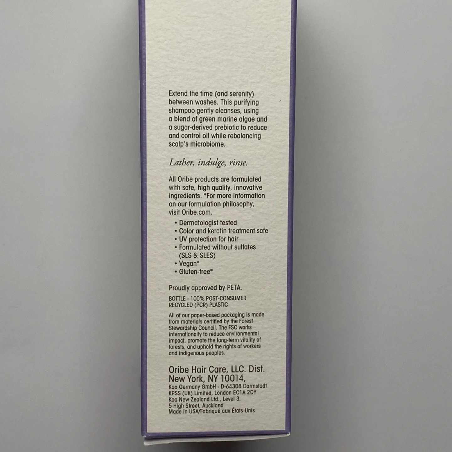 I'm selling a brand new bottle of Oribe Serene Scalp Oil Control Shampoo! This shampoo comes in its original box. - Size: 8.5 oz / 250 mL - This purifying shampoo gently cleanses, using a blend of green marine algae and a sugar-derived prebiotic to reduce and control oil while rebalancing scalp's microbiome - Dermatologist tested - Color and keratin treatment safe - UV protection for hair - Formulated without sulfates (SLS & SLES) - Vegan - Gluten-free