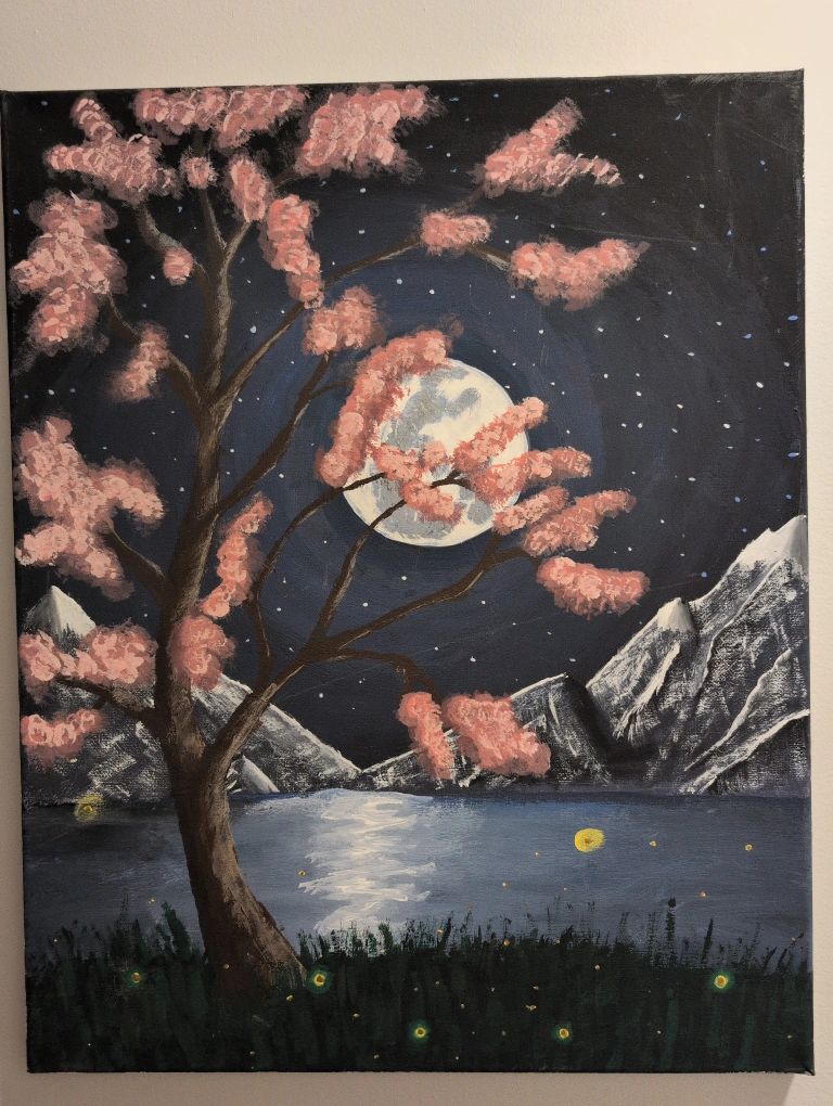 Hand-painted acrylic artwork. Depicts a cherry blossom tree at night under a full moon. Features mountains and a lake. Small details included, like fireflies.