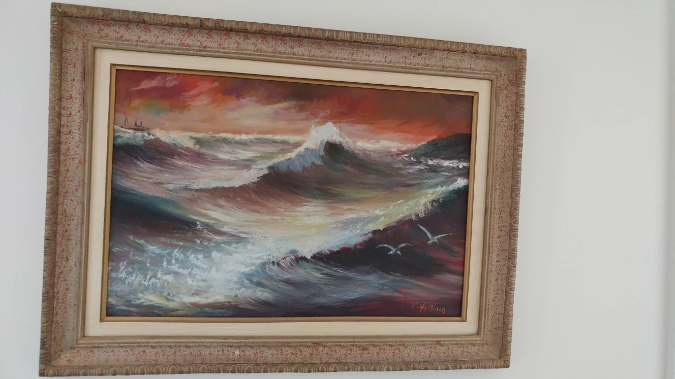 An original oil painting. Depicts a seascape. Features a detailed frame. Perfect for creating a peaceful atmosphere in your space. 30.5" x 22"