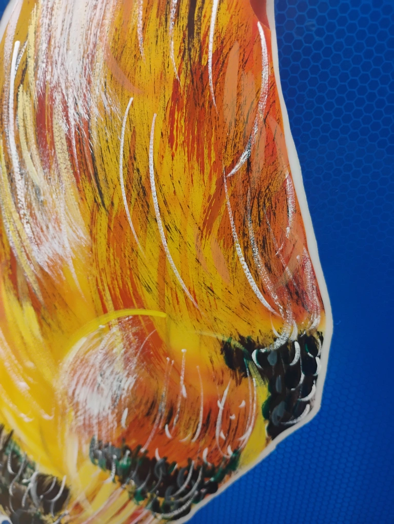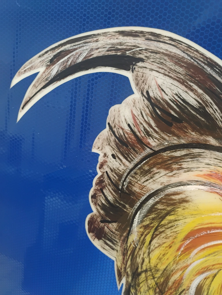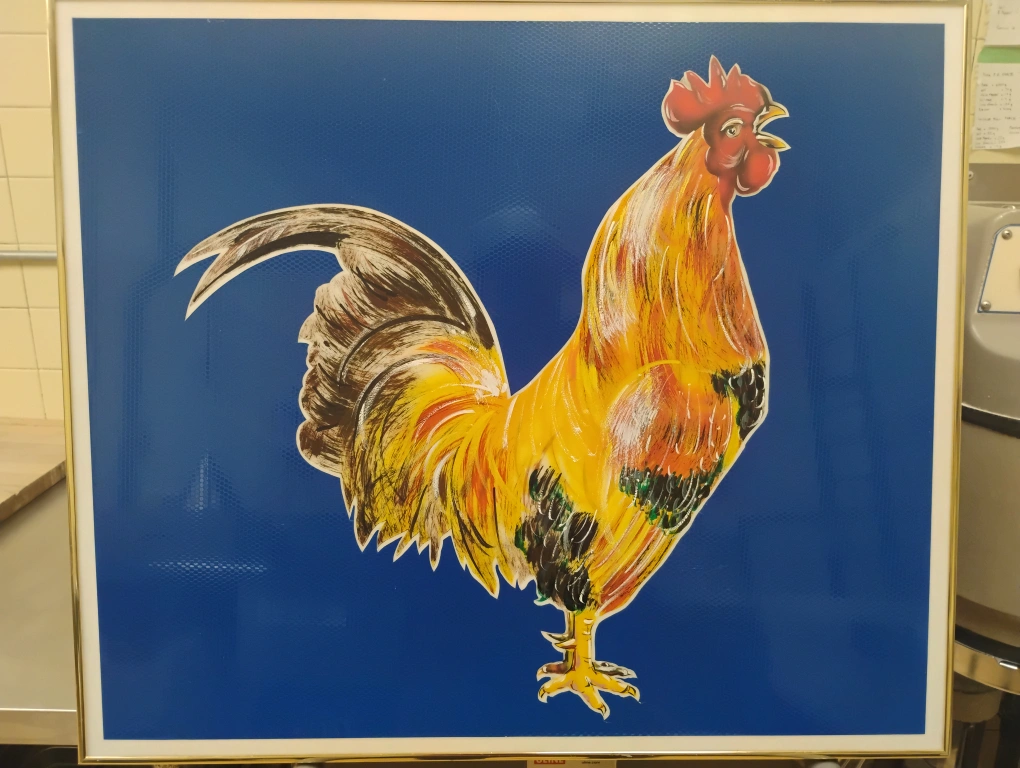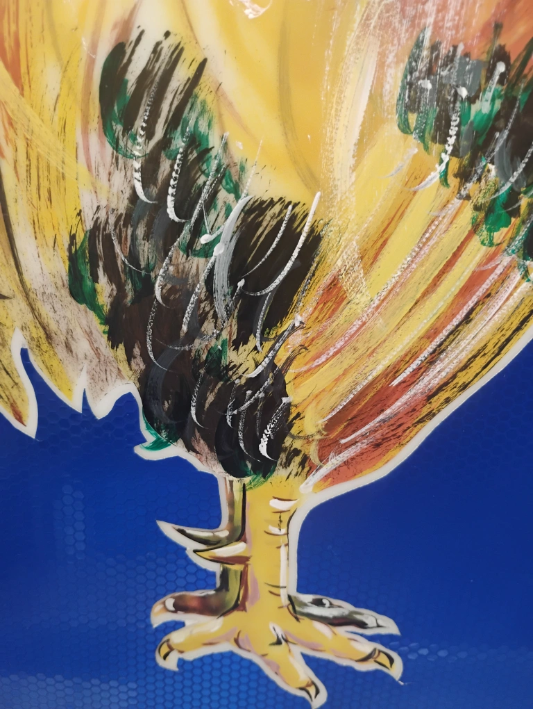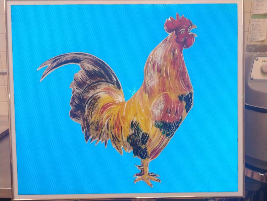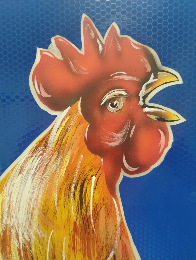 Original mixed media painting of a rooster modeled in acrylic (airbrush) and oil paint with reflective industrial signage decal background on a white acrylic substrate, which allows for it to be illuminated from the rear via strip light if you are so inclined. The blue decal material is reflective (similar to 3M reflective material) and will illuminate when the light hits it, place it across from a sunny window for maximum impact! Approximately 28"x28", framed, ready to hang. "Crow & Glow" painted by ∆rti§t ∆n°nym°μ§.