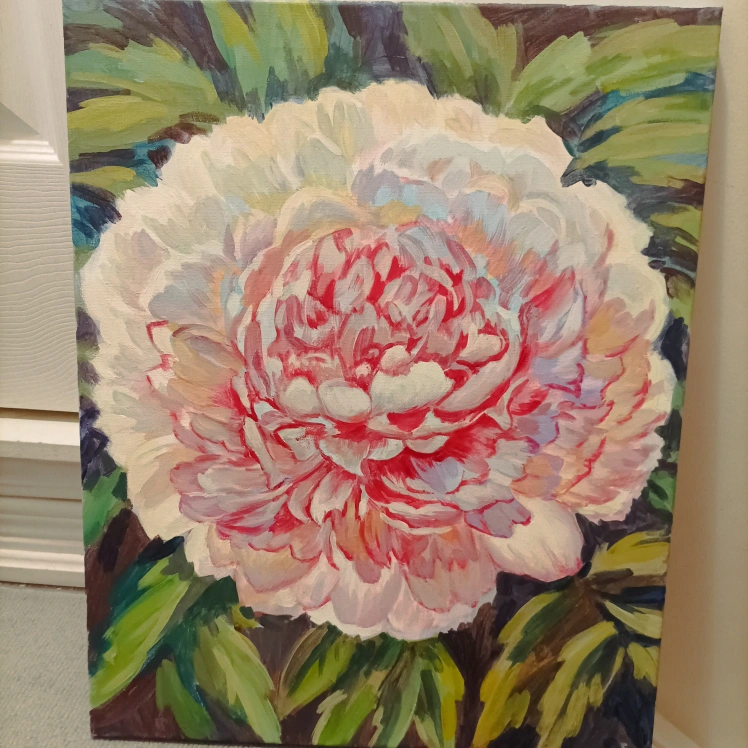 Beautiful original acrylic painting of a single pink peony flower. The painting is on a stretched canvas and is ready to hang.