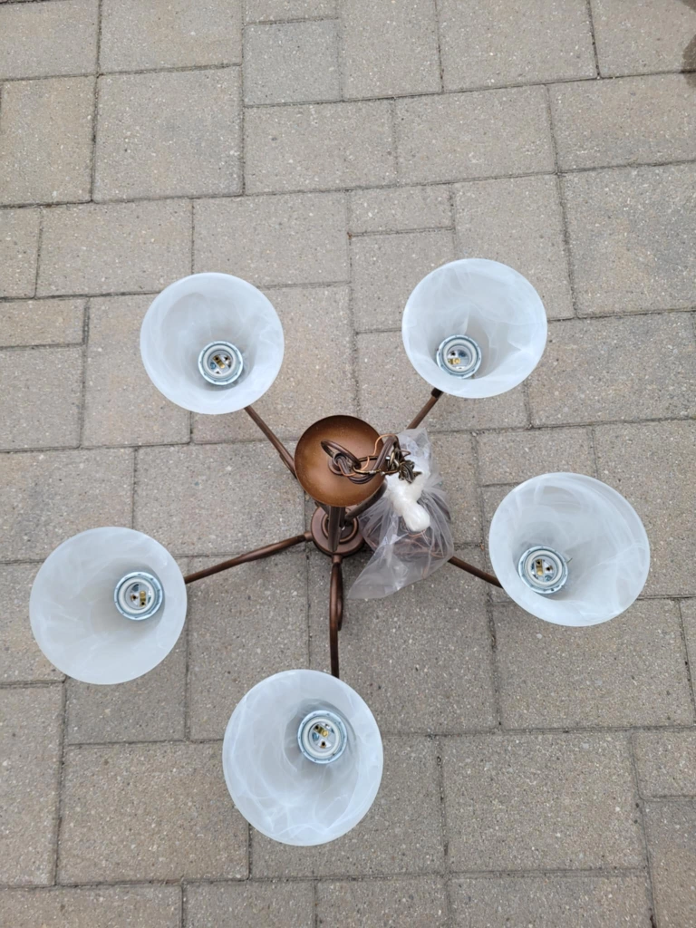 I'm selling a used chandelier featuring a bronze finish and five frosted glass shades, perfect for adding a touch of elegance to any dining room or living space. This item has been previously installed and enjoyed, but is still in good working condition. No bulbs are included! Here are some details: * Finish: Bronze * Number of Lights: 5 * Shade Material: Frosted Glass * Style: Traditional.