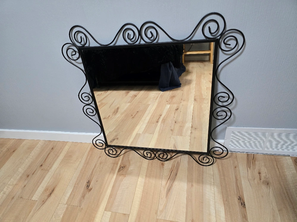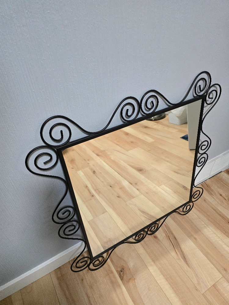 This is a lovely ornate mirror with a black metal frame. It would look great in any room and add a touch of elegance to your home decor. It's in great condition and ready for a new home!