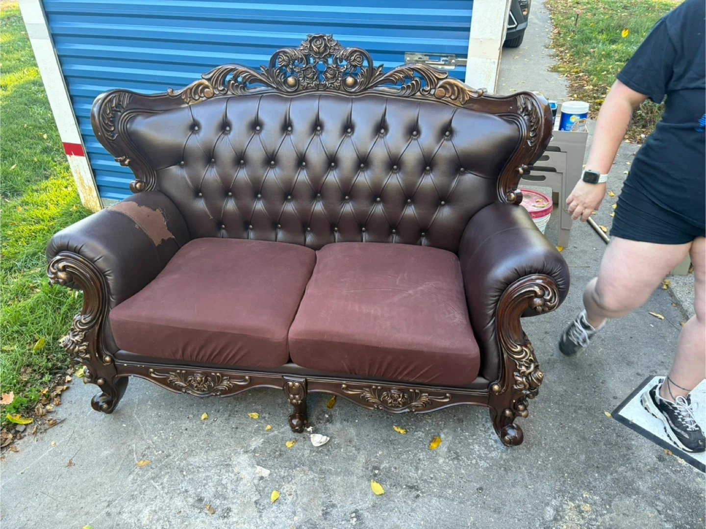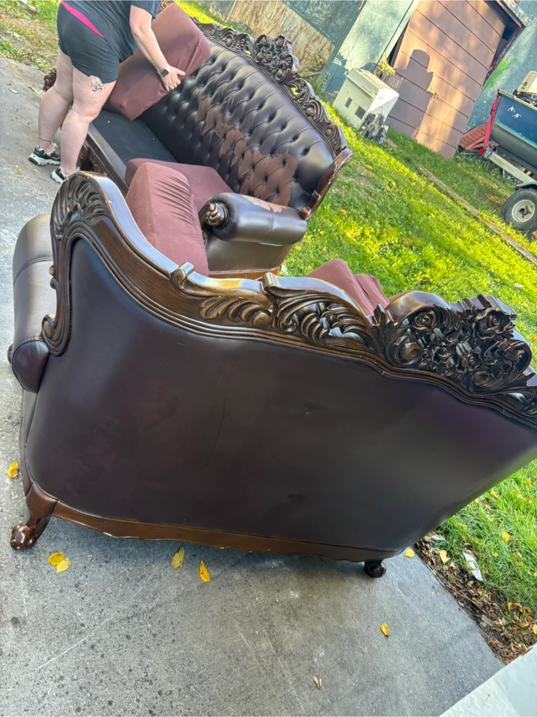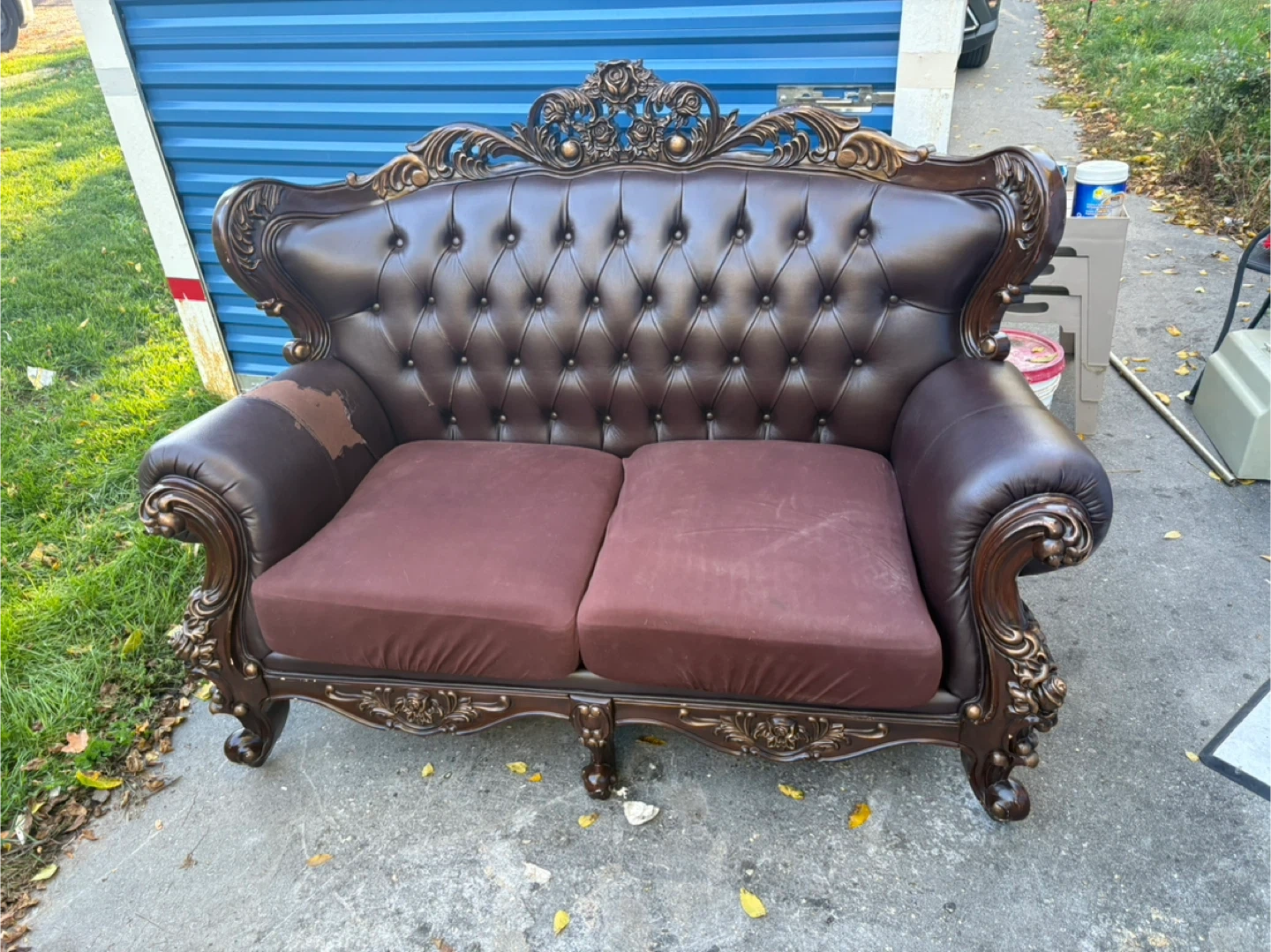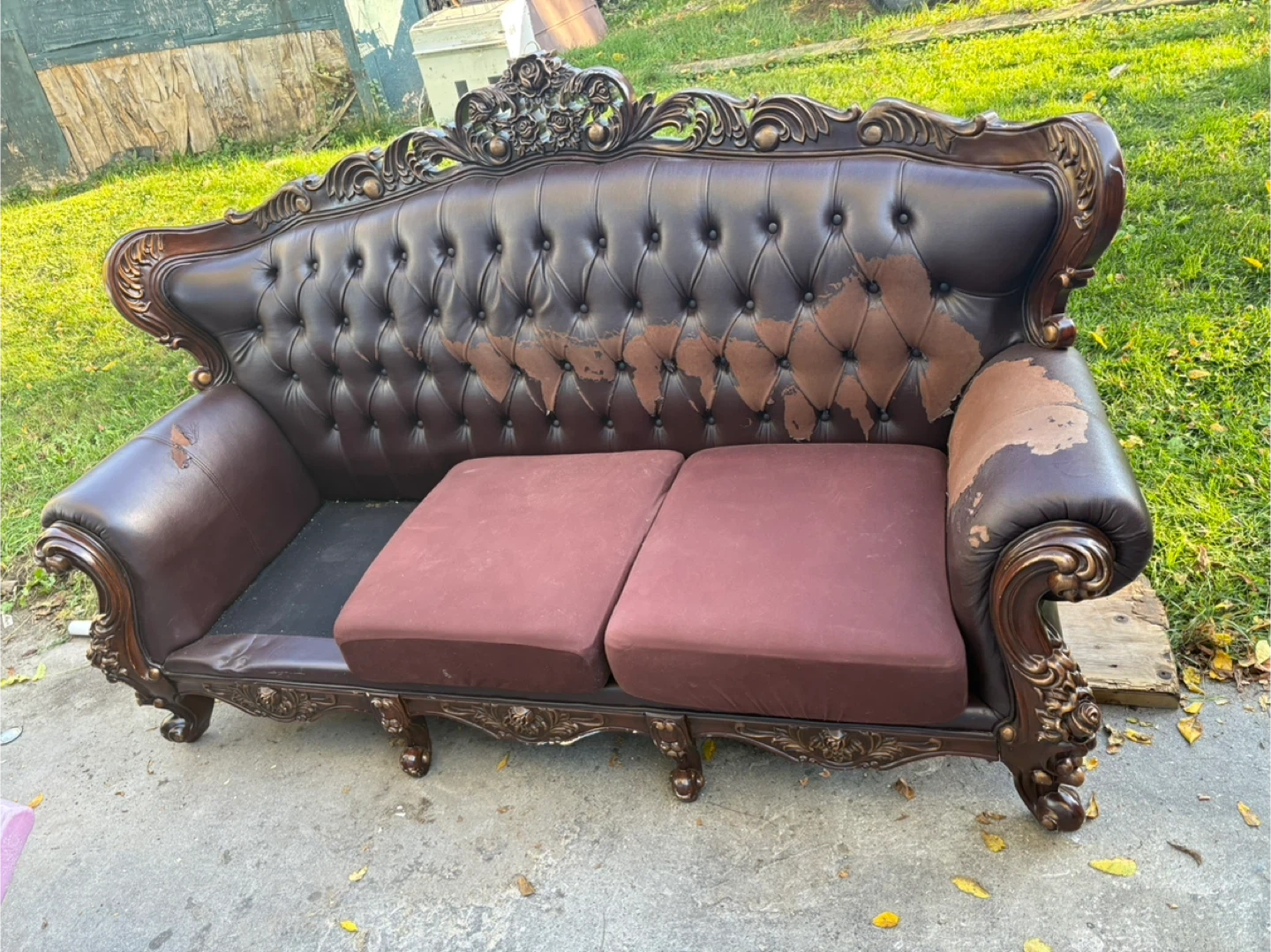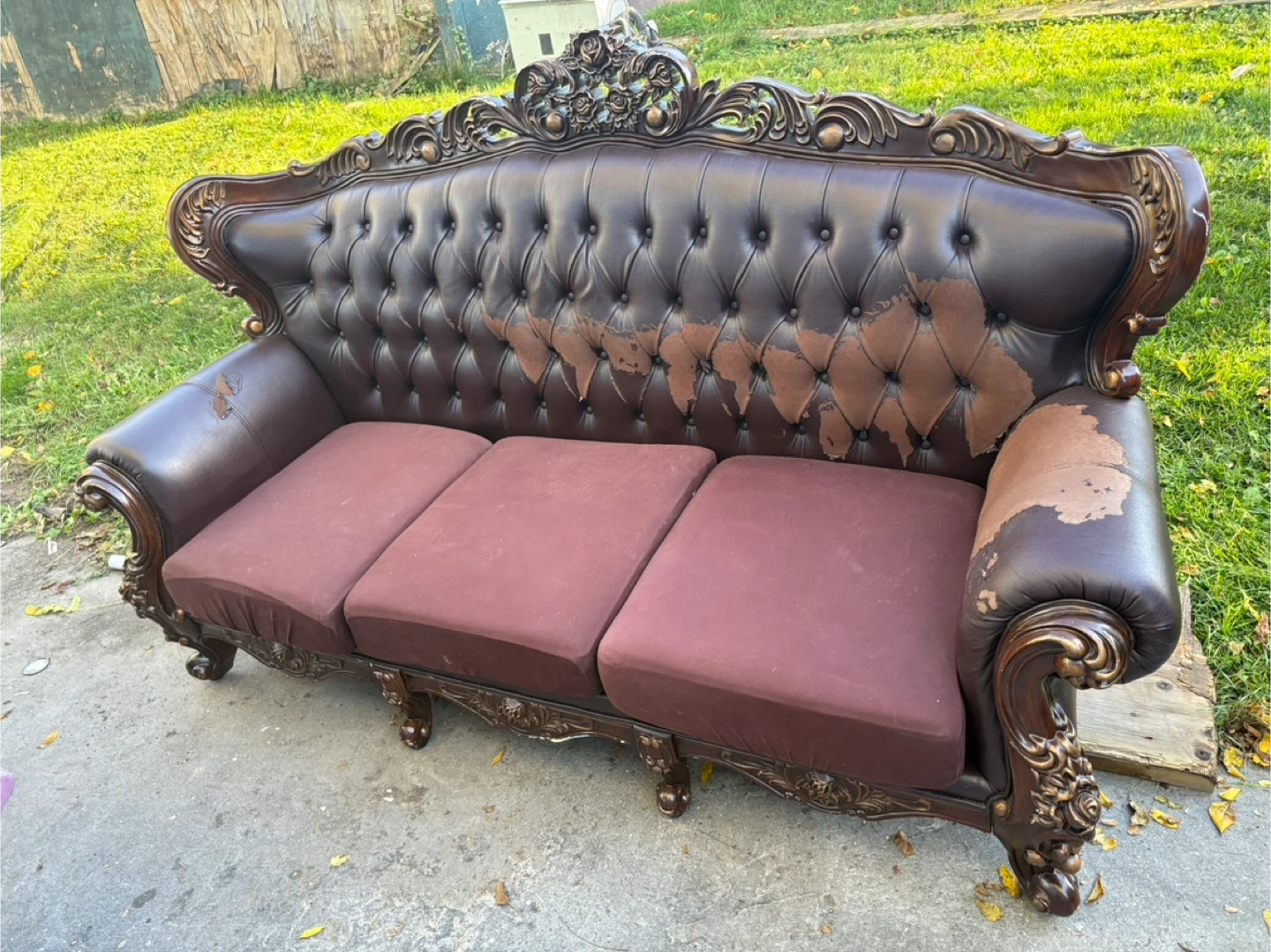 This ornate brown leather sofa has seen better days. It shows significant wear and tear, including peeling leather and worn spots. The cushions are in decent shape though. Perfect for a fixer-upper or someone looking for a project!