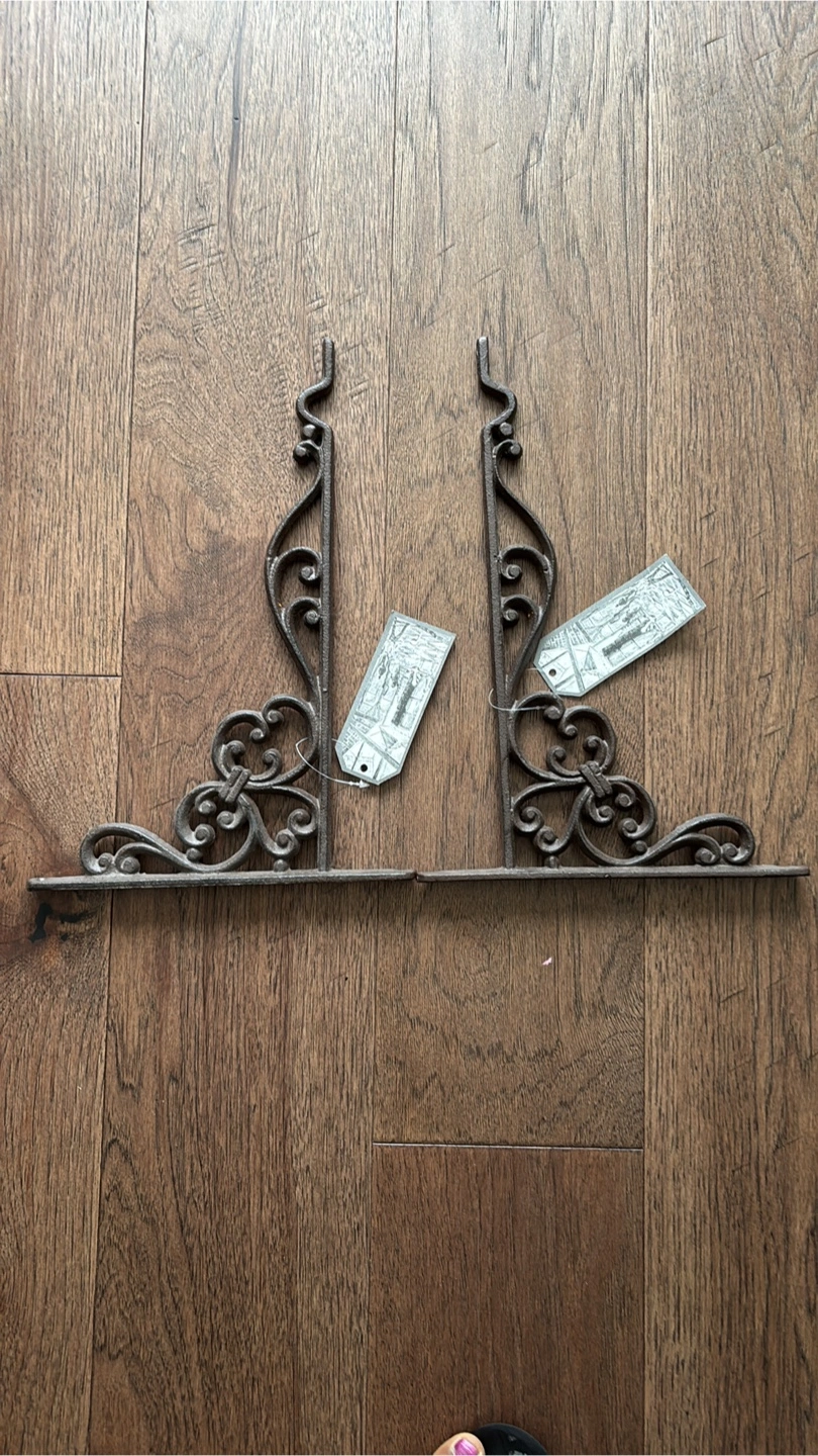 Pair of decorative plant hangers. Dark brown finish. Intricate scrollwork design. Perfect for adding a touch of elegance to your home.