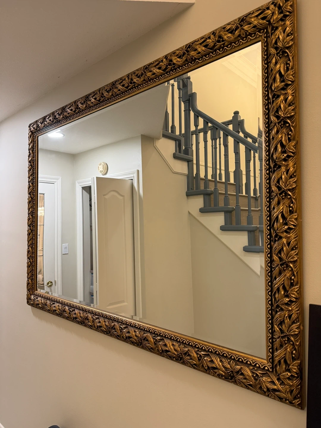 Selling a beautiful wall mirror with an ornate gold frame. It's in great condition and would add a touch of elegance to any room! The frame has a lovely leaf pattern.