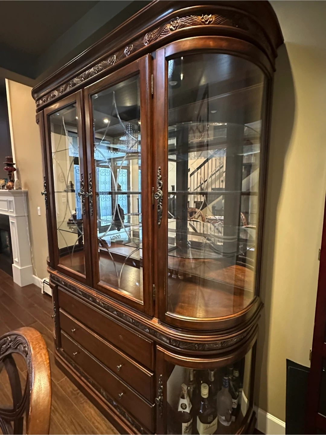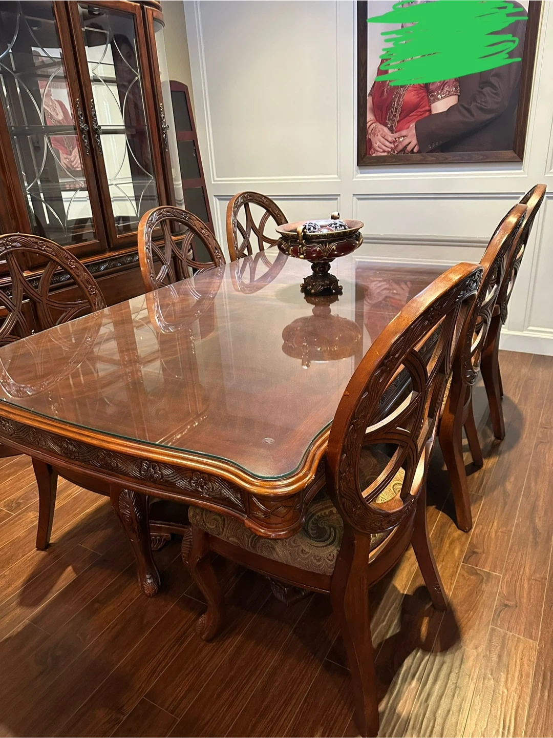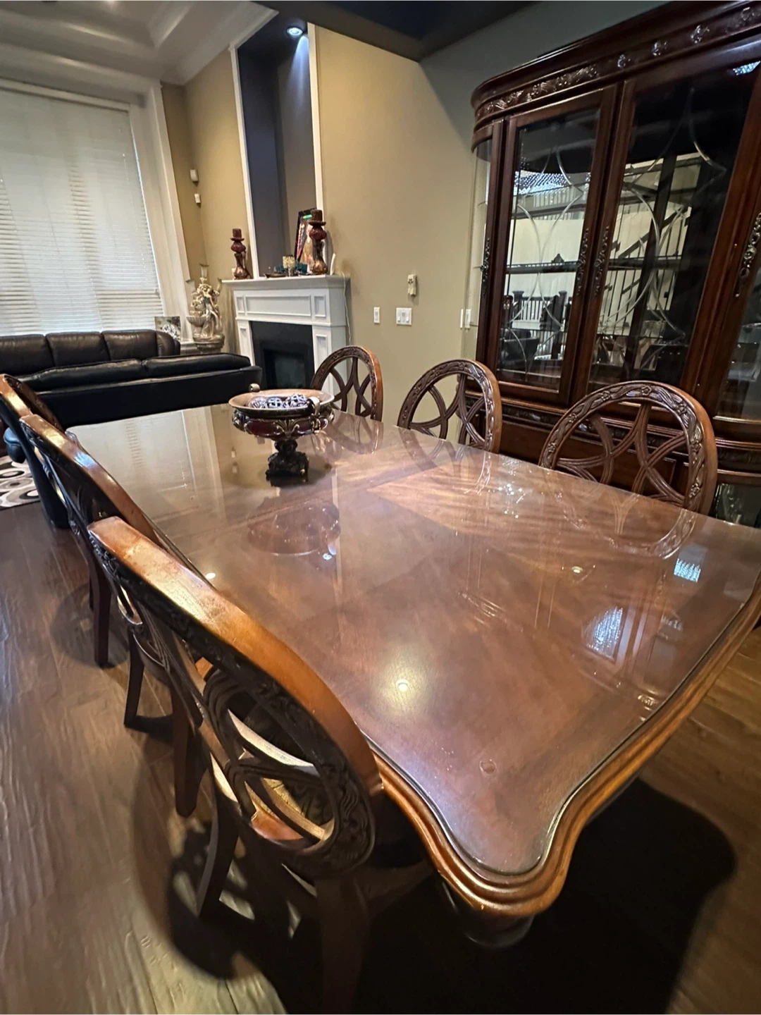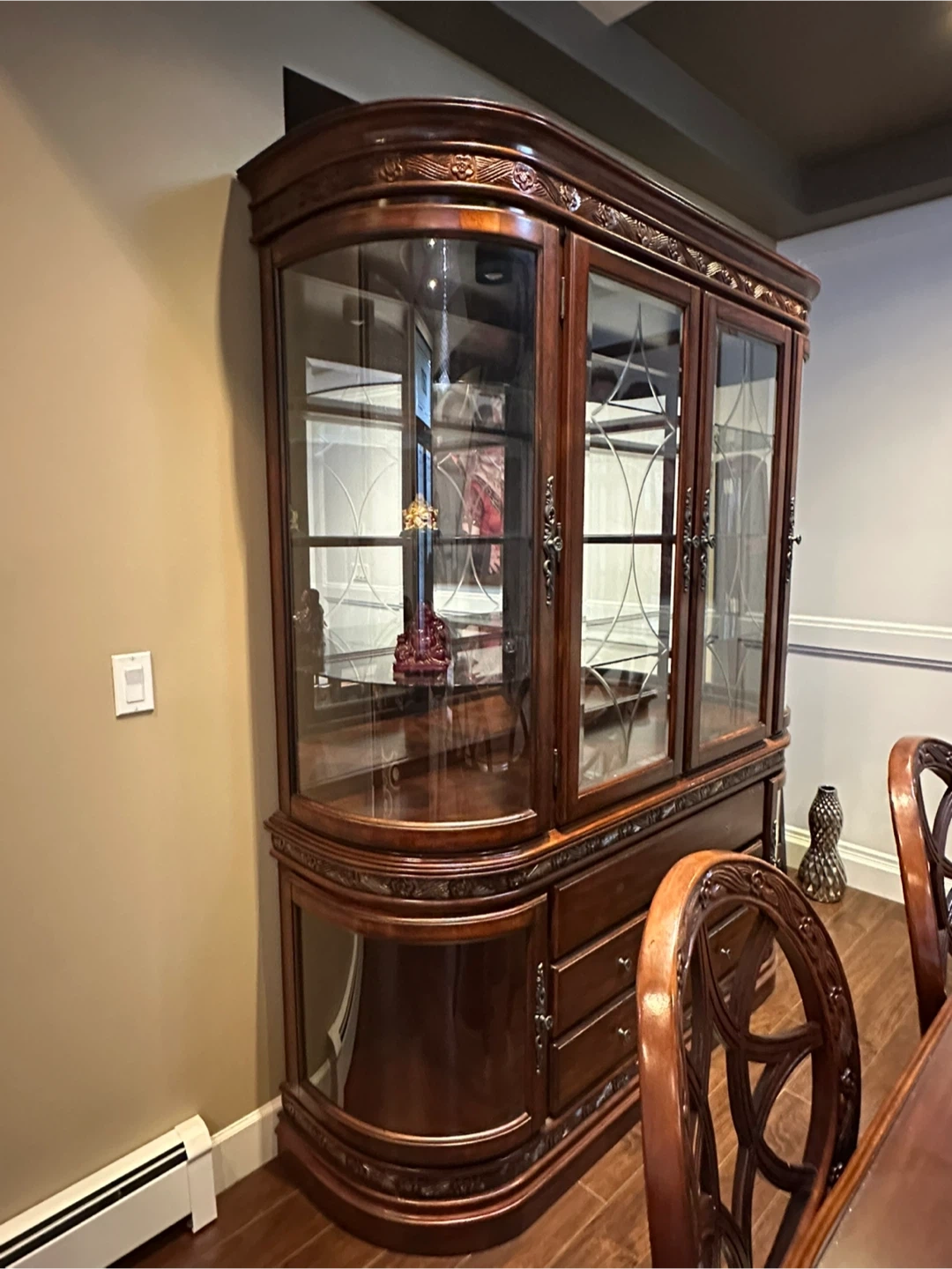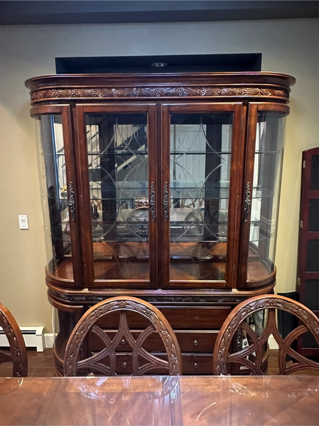 Beautiful china cabinet with ornate wooden detailing. It has glass doors and multiple shelves for displaying your favourite items. There are also drawers and a lower cabinet for additional storage. Matching dining table with 6 ornate chairs to match! Perfect for adding a touch of elegance to your dining room! Excellent condition! $1100 for everything!