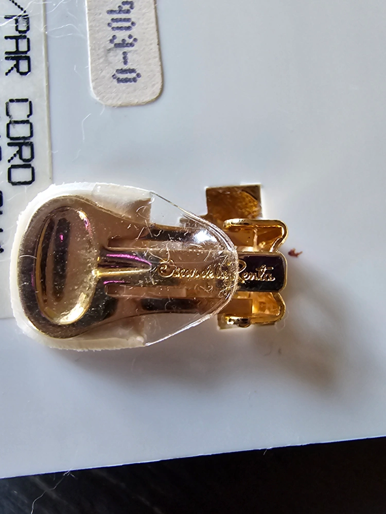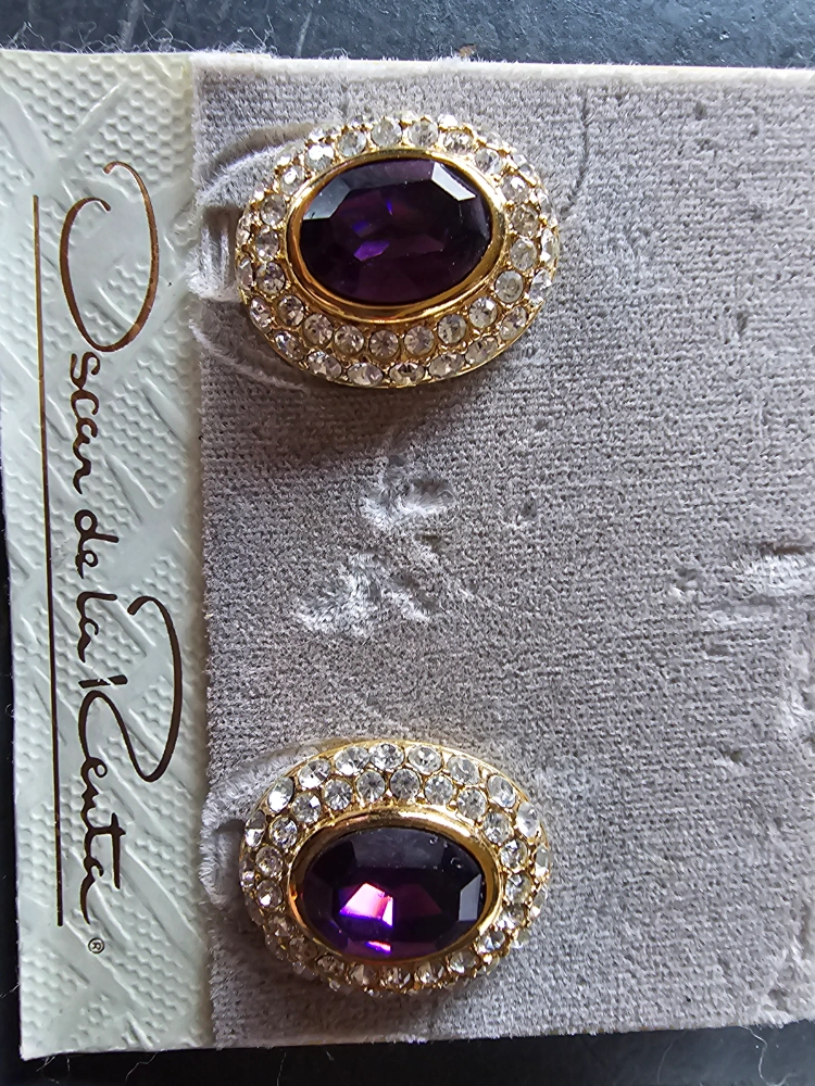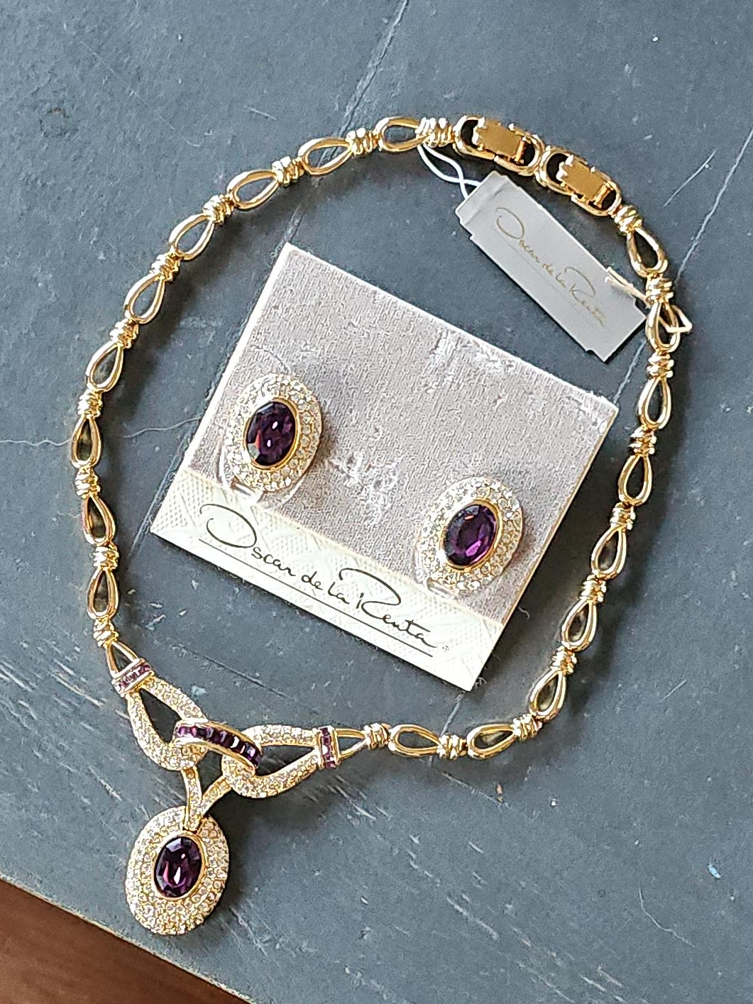 This is a beautiful Vintage Oscar de la Renta necklace and earrings set. The set features gold-tone metal with purple and clear rhinestones. The original price tag shows $180 for the necklace and $75 for the earrings. Never Worn