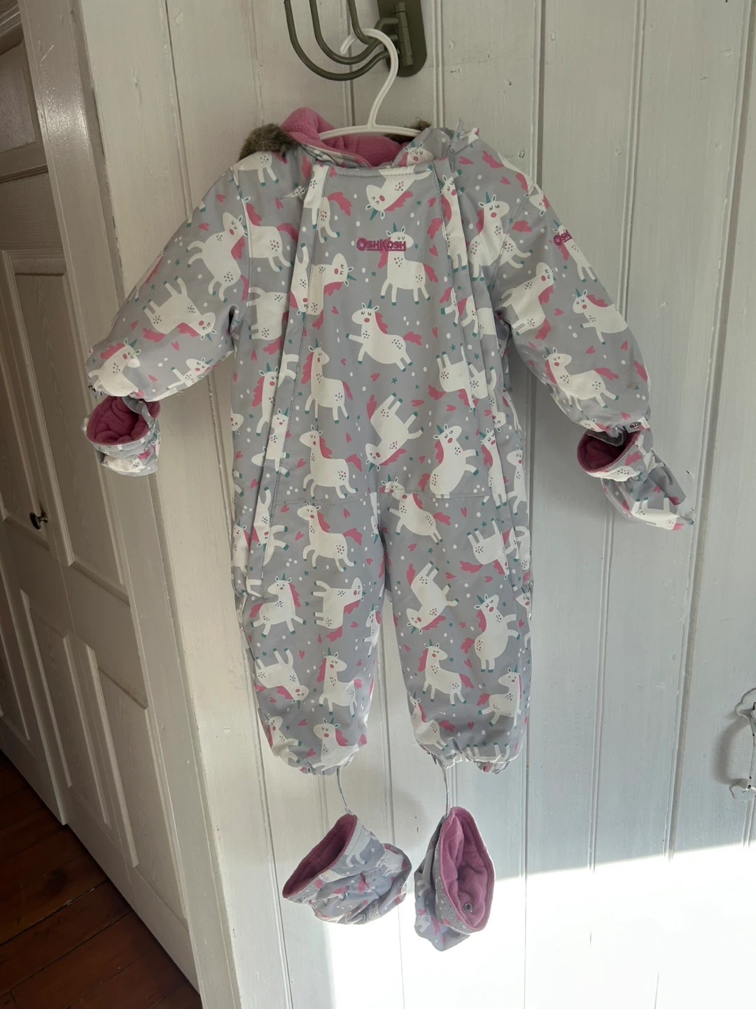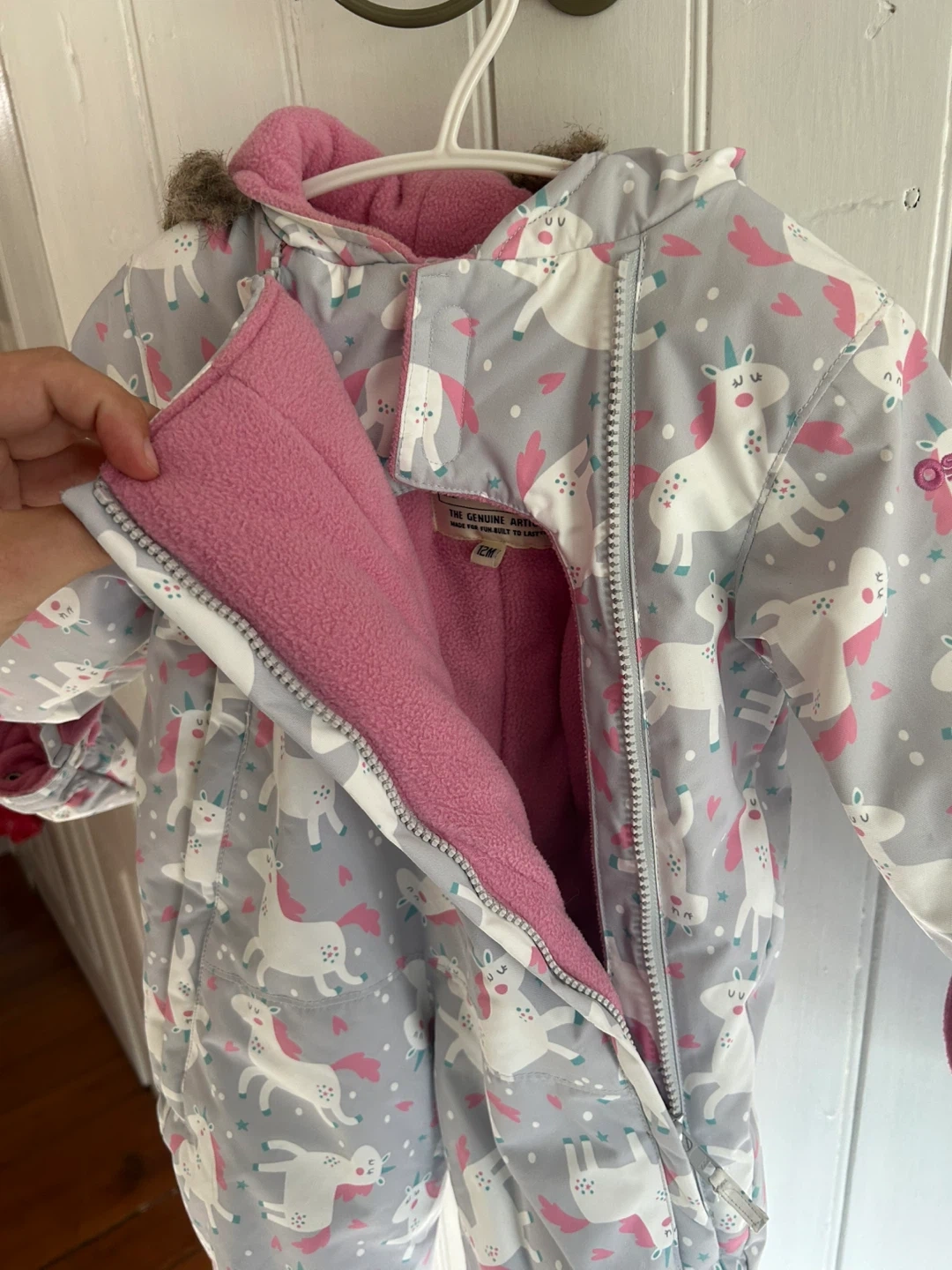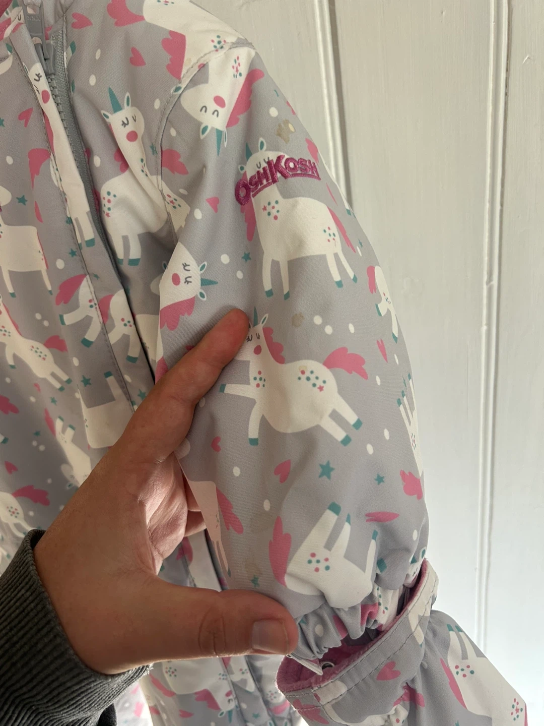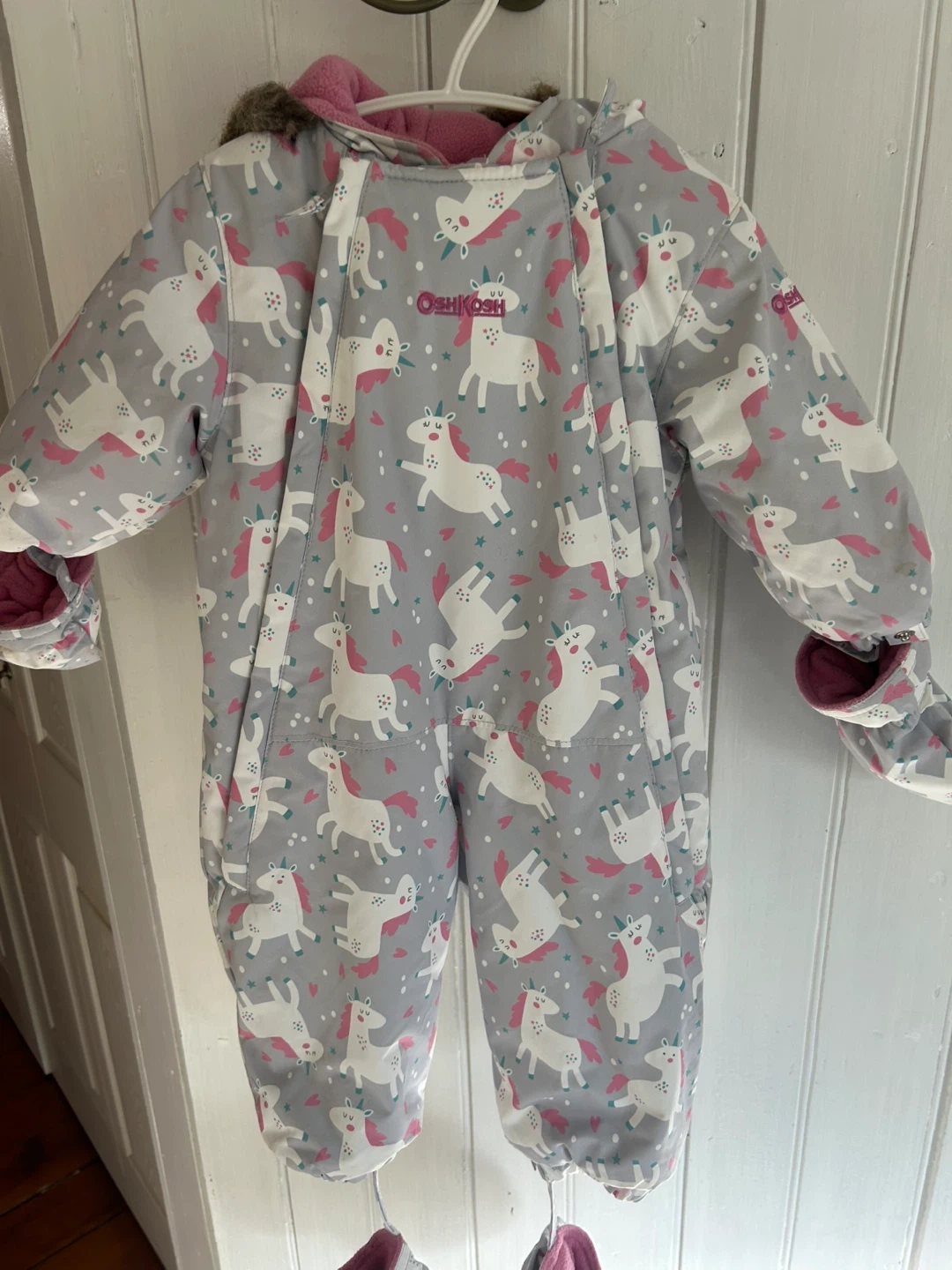 Oshkosh brand. Snowsuit with double zipper and removable mittens and booties. Grey, white & pink unicorn print. Size 12m. Like new condition, Warm and waterproof with no wear but some staining I haven’t tried removing, all photographed $15 Pickup between kincardine & ripley or I can arrange delivery in port Elgin-Owen sound, walkerton-Durham, wingham-listowel-kw/cambridge, goderich-bayfield, Woodstock & Arthur-Orangeville-Newmarket-Lindsay-Peterborough AREAS.