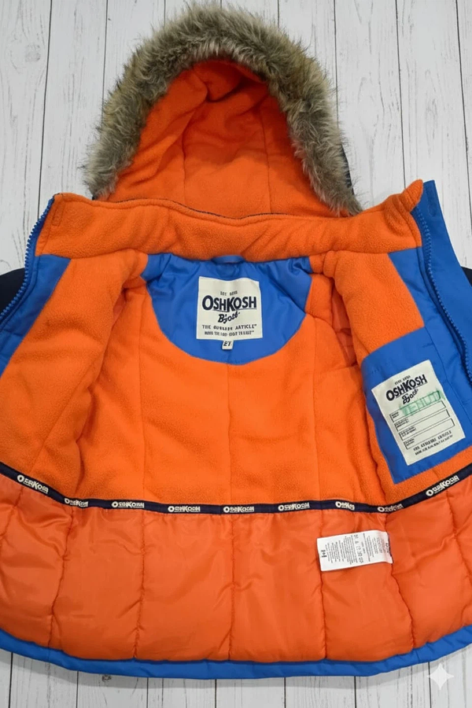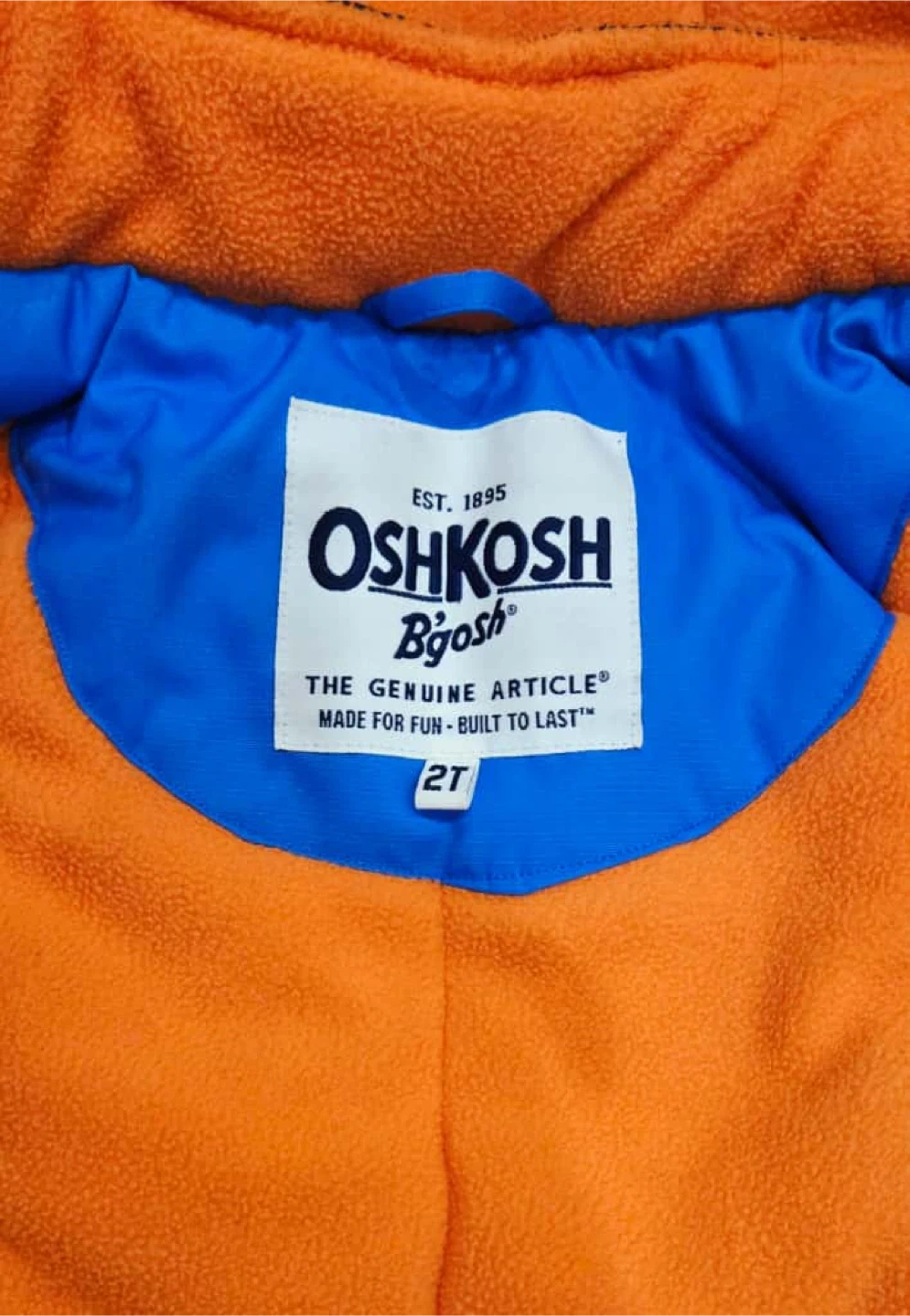 Cozy OshKosh B'gosh winter jacket, perfect for keeping your little one warm! Size: 2T Colour: Blue and Navy with Orange lining It's in brand new condition and ready for the winter season. Only one time used.