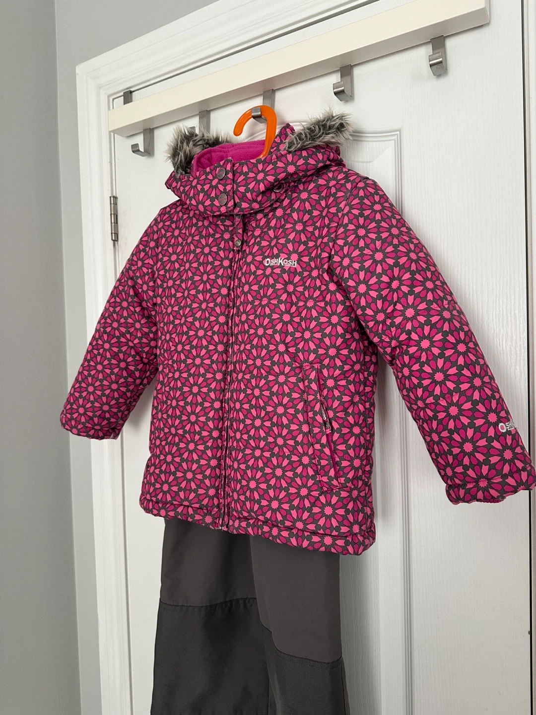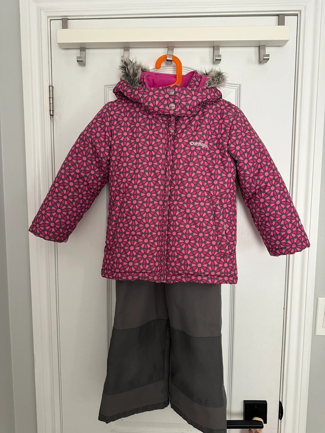 Selling a cute OshKosh B'gosh girls' snowsuit! It features a pink floral pattern on the jacket and grey snow pants. Perfect for keeping your little one warm and stylish this winter