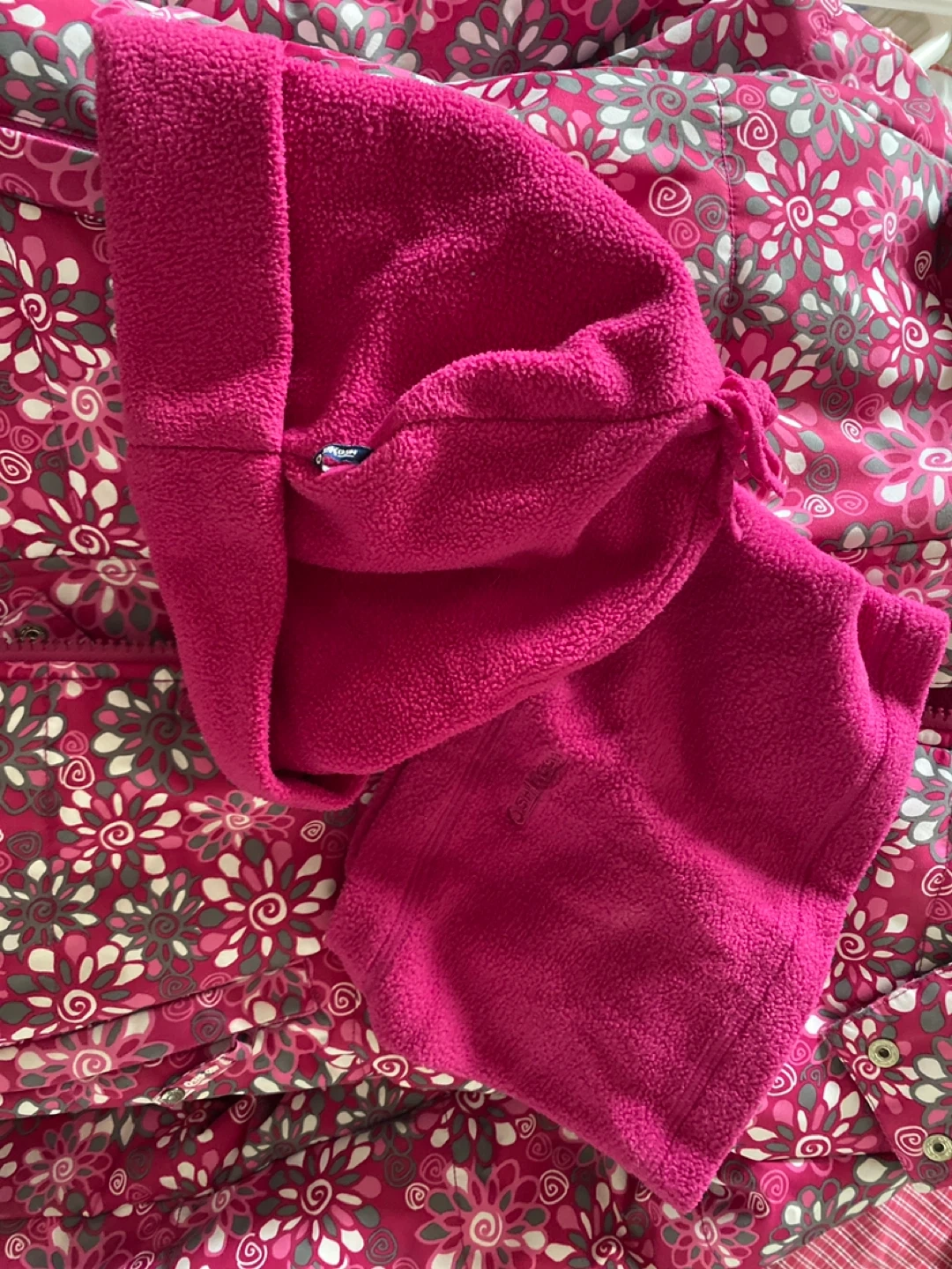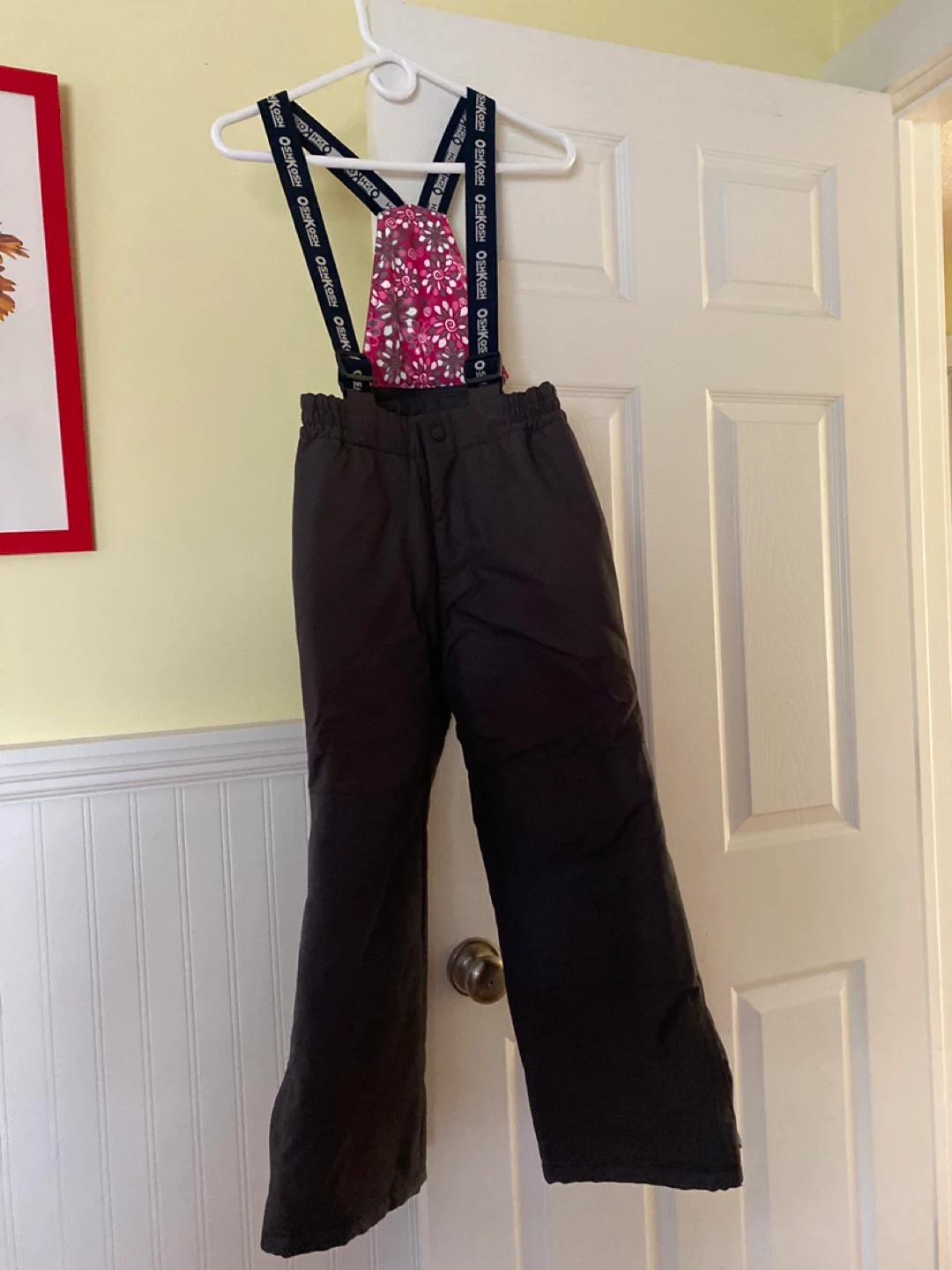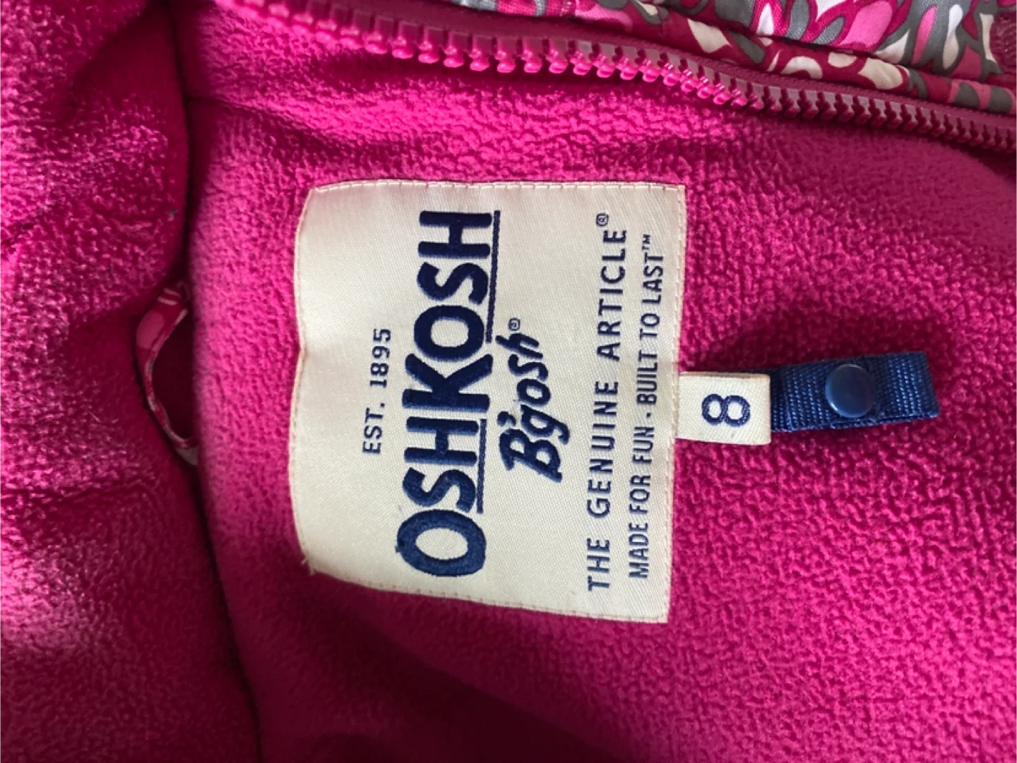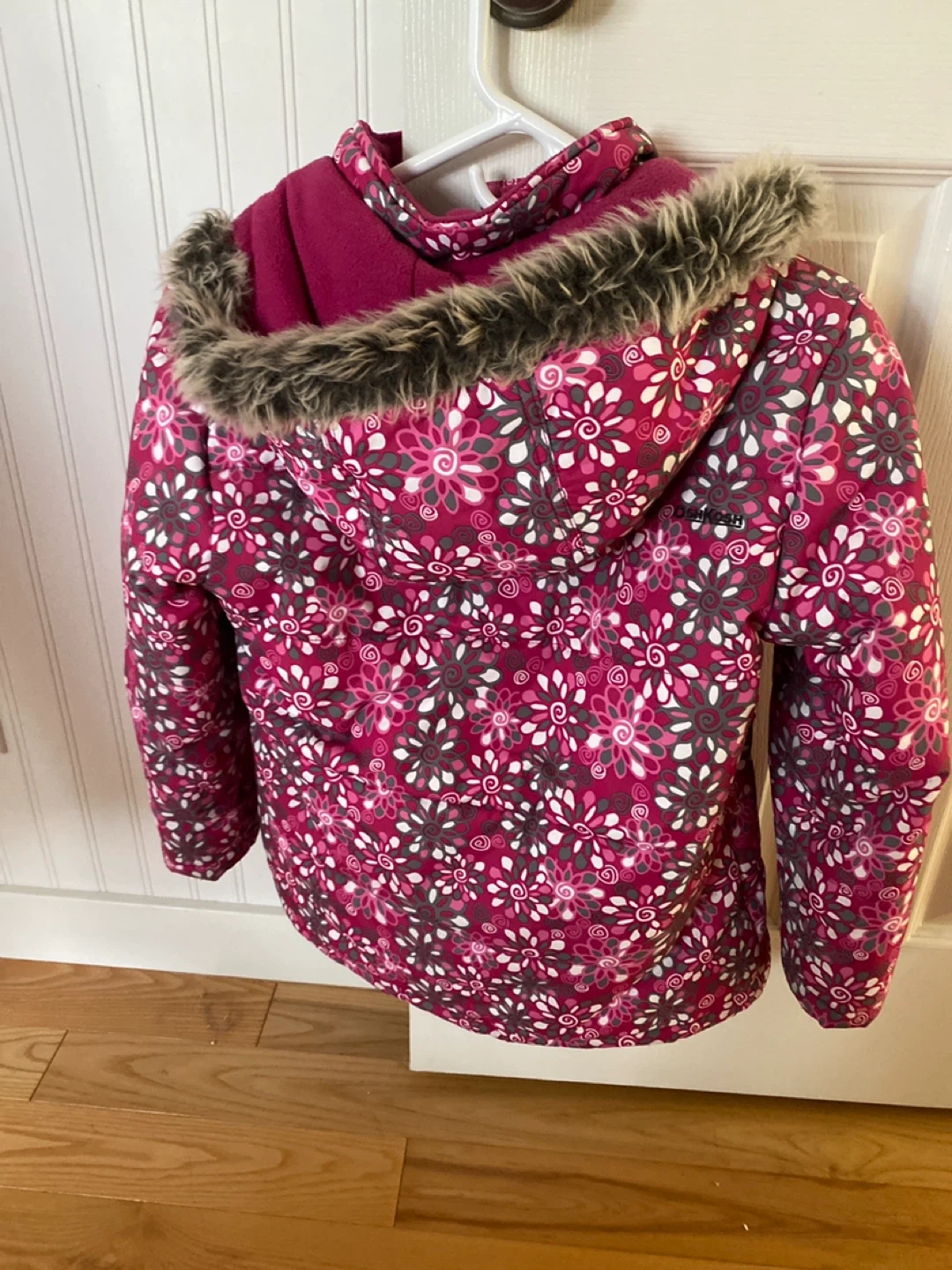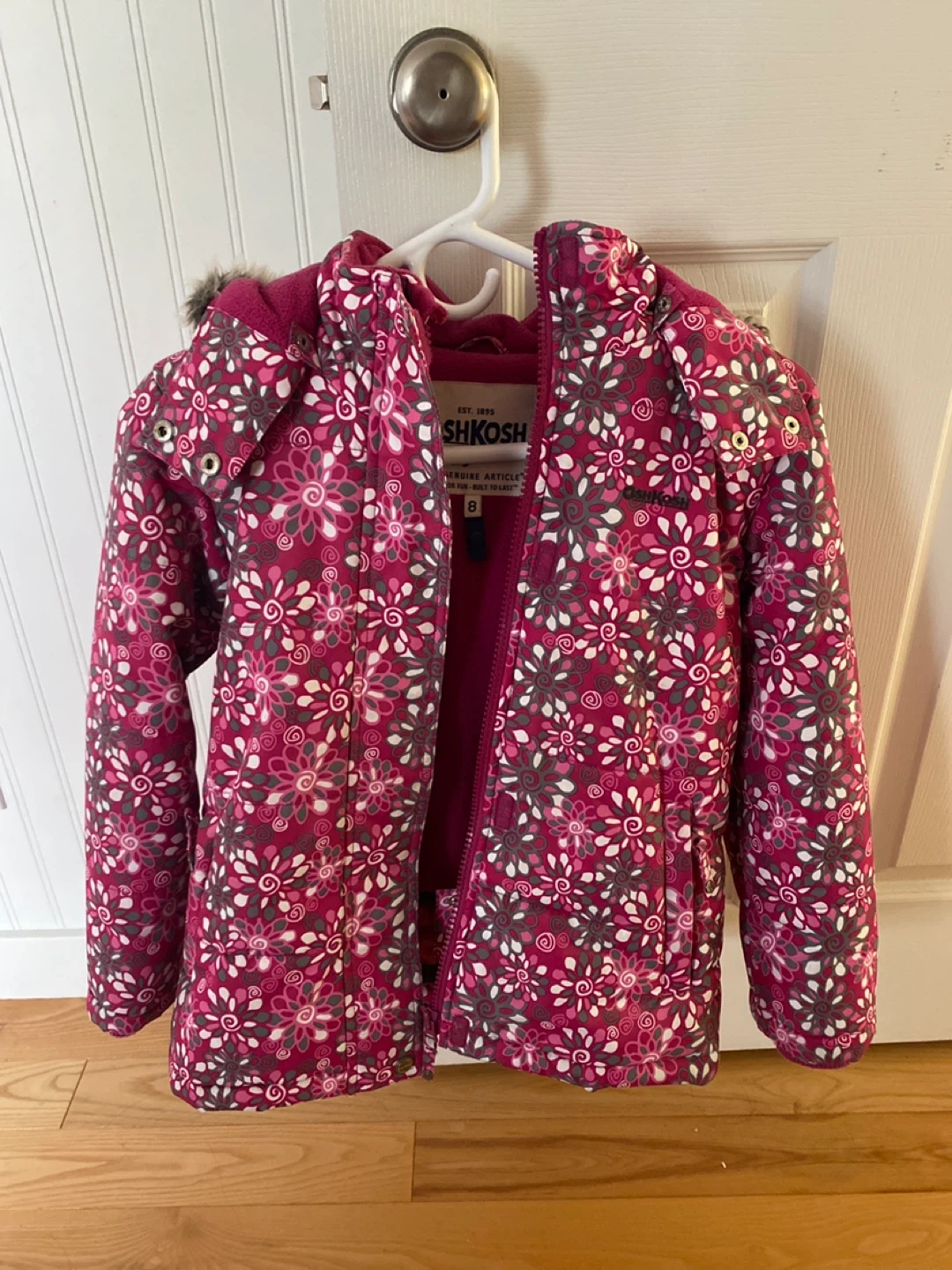 Selling a super cute OshKosh Bgosh winter coat and snow pants set for a girl. The coat is a size 8 and features a fun floral pattern with a faux fur-trimmed hood. The pants are grey and have adjustable suspenders for a great fit. Comes with matching toque and neck warmer. Perfect for keeping your little one warm and stylish this winter!