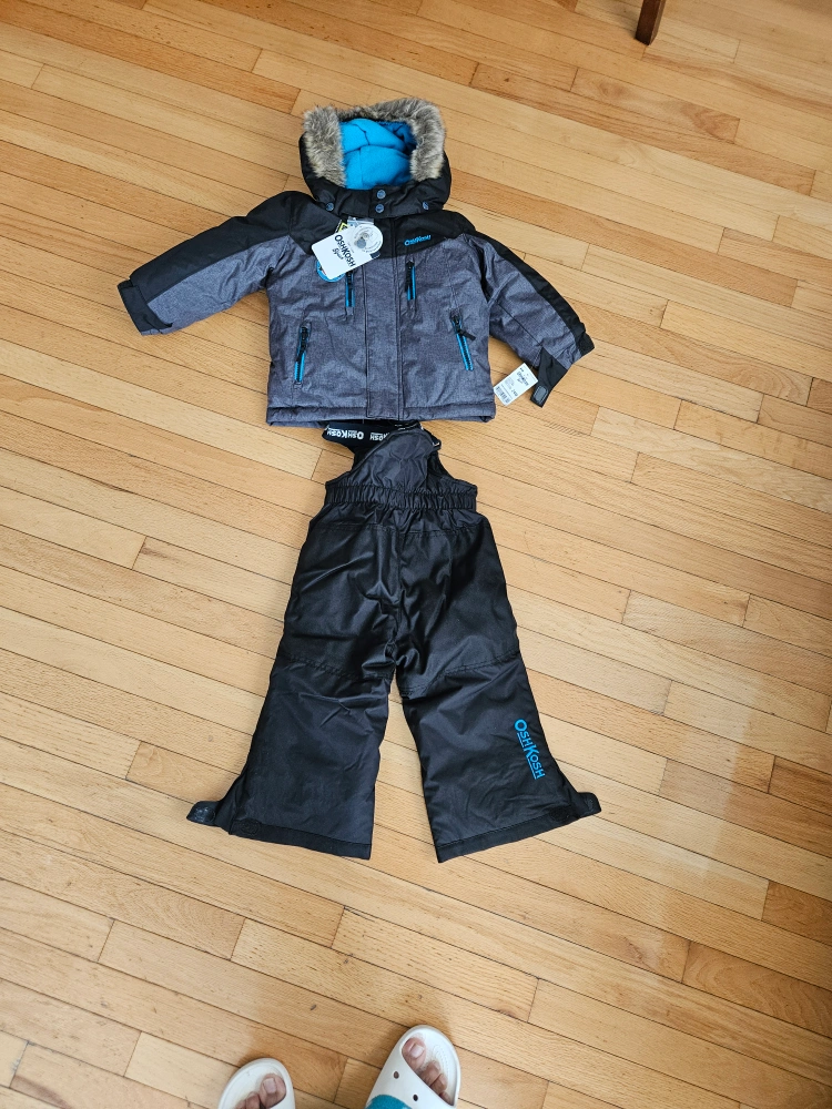 Cozy OshKosh B'gosh snowsuit set, perfect for keeping your little one warm this winter! Includes a jacket with a faux fur-trimmed hood and matching black bib snow pants. Great for outdoor adventures! size 24 month