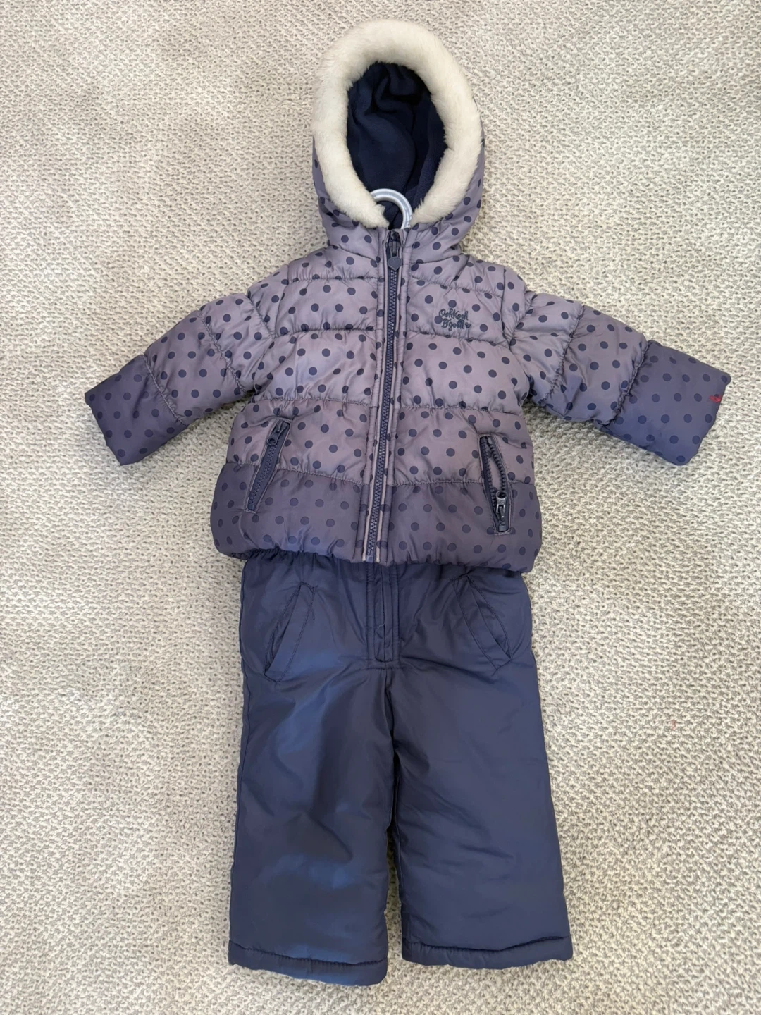 Keep your little one warm this winter with this adorable OshKosh B'Gosh snowsuit set! The set includes a polka dot puffer jacket with a faux fur-trimmed hood and matching navy blue snow pants. It's in great condition and ready for some snowy adventures