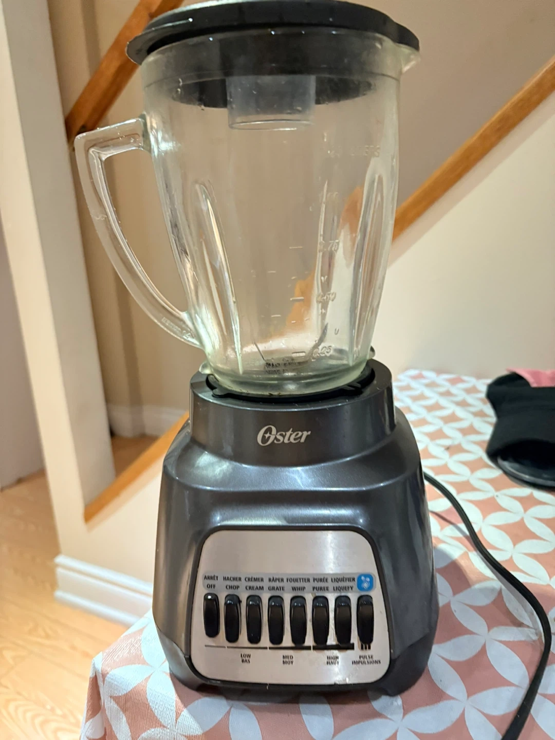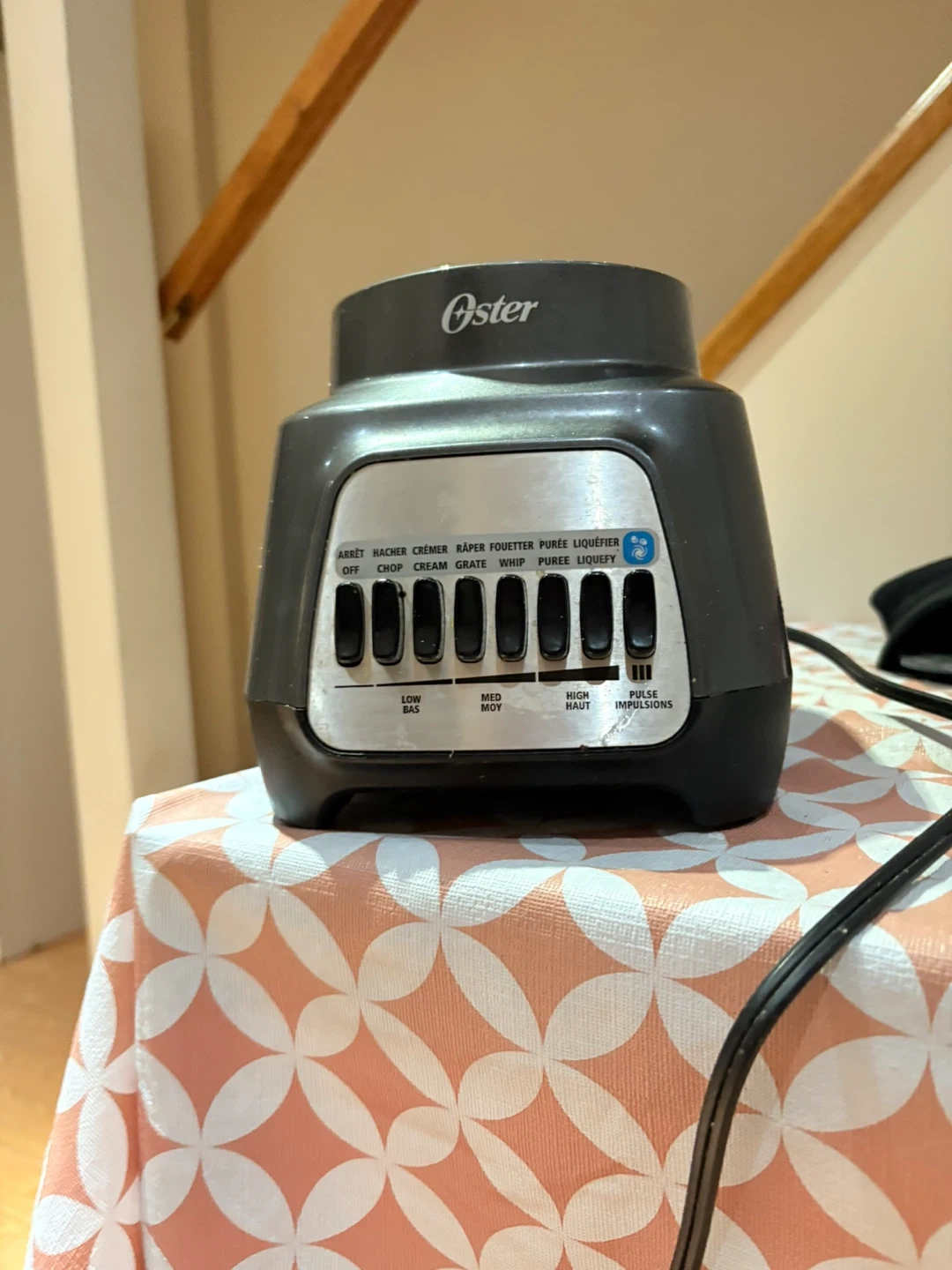 Selling an Oster blender in great condition. It has multiple settings for chopping, creaming, grating, whipping, and pureeing. The settings range from low to high, plus a pulse option. Perfect for making smoothies or soups!