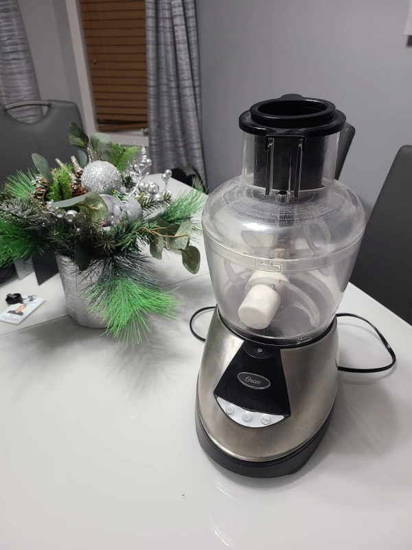 Selling an Oster food processor. It's in good working condition and ready to help with your meal prep! It features an off, on, and pulse button for easy operation