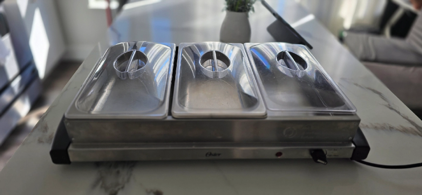 Keep your food warm and ready to serve with this Oster Triple Buffet Server! It's perfect for parties, potlucks, or family gatherings. The unit has three separate warming trays, each with its own lid, so you can keep different dishes at the perfect temperature. It also features an adjustable temperature control, so you can customize the heat to suit your needs. Pick up in Queensborough, Newwestmister. Price Firm.