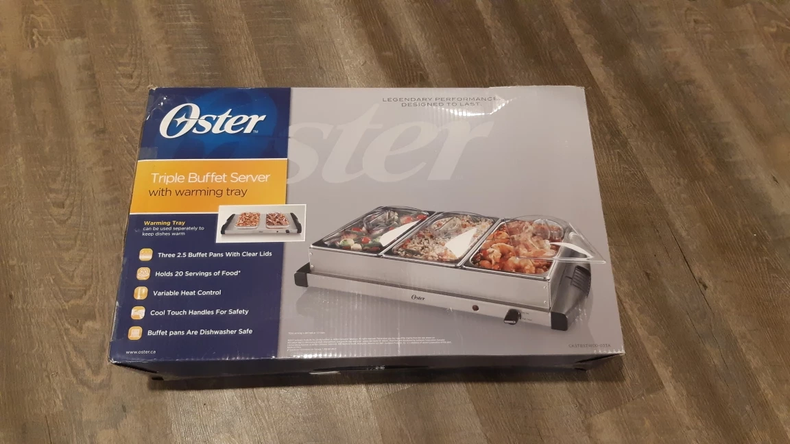 Selling a brand new Oster Triple Buffet Server with Warming Tray! It comes in its original box and features: - Warming tray that can be used separately - Holds 20 servings of food - Variable heat control - Cool-touch handles for safety - Dishwasher-safe buffet pans